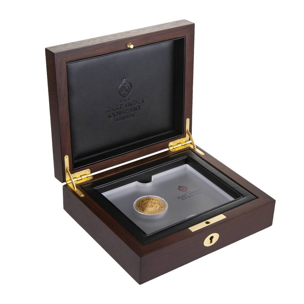 The East India Company is pleased to announce the release of the third coin in this uniquely popular Trade Dollar Collection. Struck in ultra-high relief, the reverse side of the gold one ounce proof quality pieces, features an exceptionally detailed depiction of the classic Chinese dragon in the centre, surrounded by the text: “THE EAST INDIA COMPANY”, the denomination and a traditional oriental patterned border which appears on each Trade Dollar in the collection.