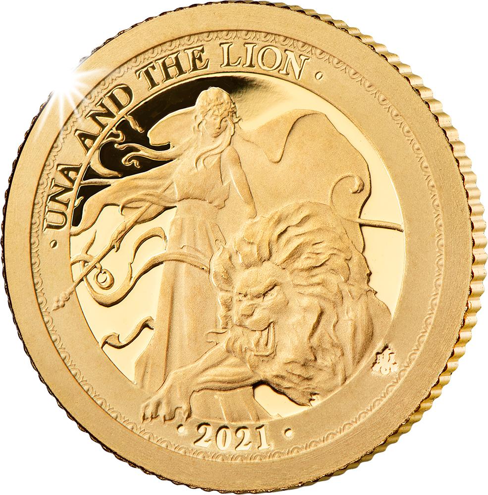 Celebrating our heroine Una, an iconic symbol of beauty and honour, and her majestic protector – the lion, the 2021 Una & the Lion 1/2g Gold Proof coin features a beautiful new design by engraver Glyn Davies. The 2021 powerful and dramatic design highlights the beauty of Una and the raw power of the lion.