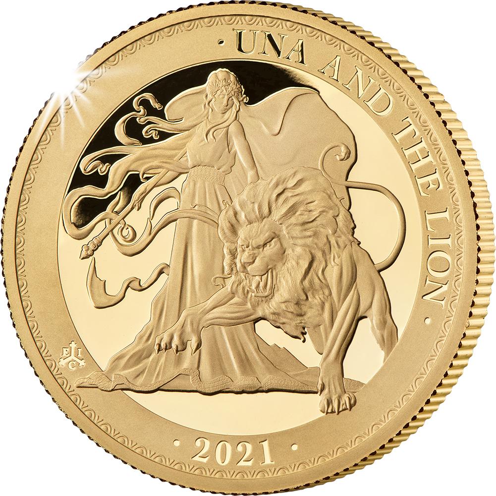 Celebrating our heroine Una, an iconic symbol of beauty and honour, and her majestic protector – the lion, the 2021 Una & the Lion 1oz Gold Proof coin features a beautiful new design by engraver Glyn Davies. The 2021 powerful and dramatic design highlights the beauty of Una and the raw power of the lion.