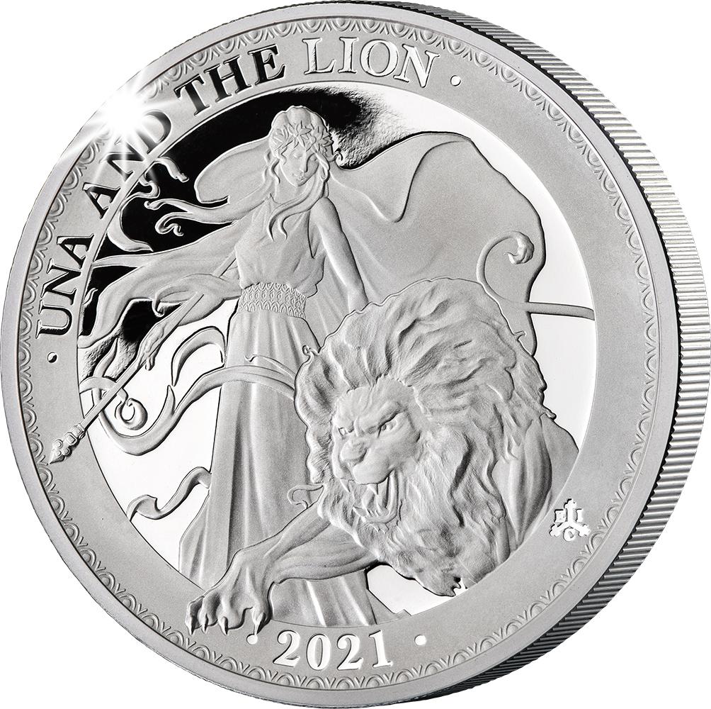 Celebrating our heroine Una, an iconic symbol of beauty and honour, and her majestic protector – the lion, the 2021 Una & the Lion 1oz Silver Proof coin features a beautiful new design by engraver Glyn Davies. The 2021 powerful and dramatic design highlights the beauty of Una and the raw power of the lion.