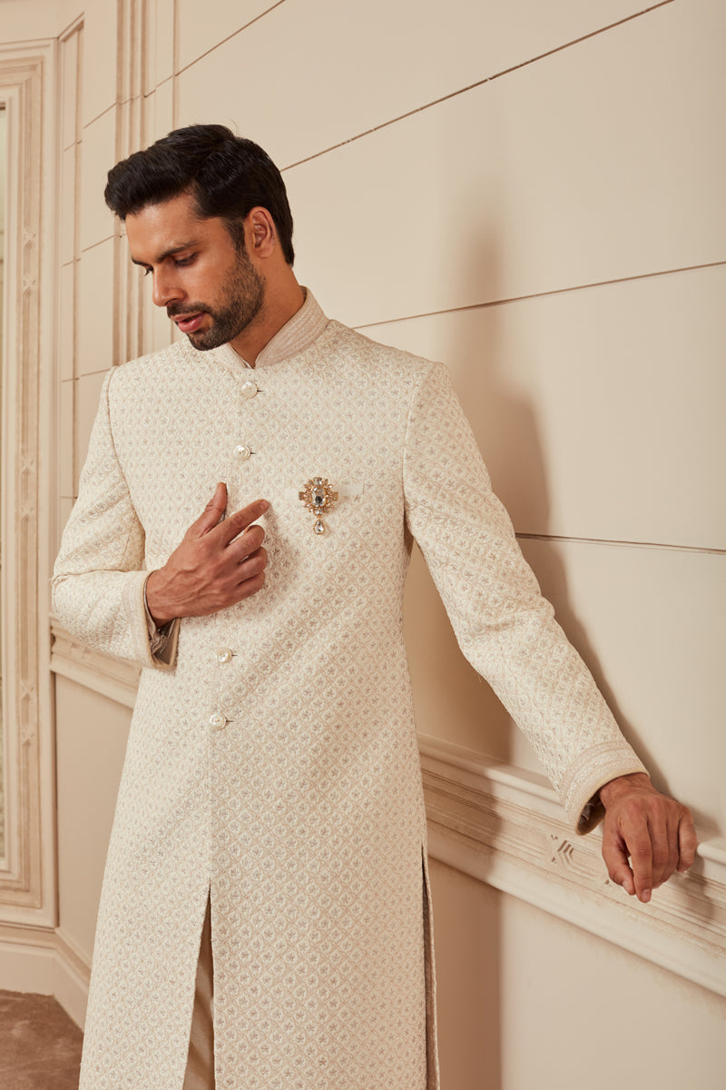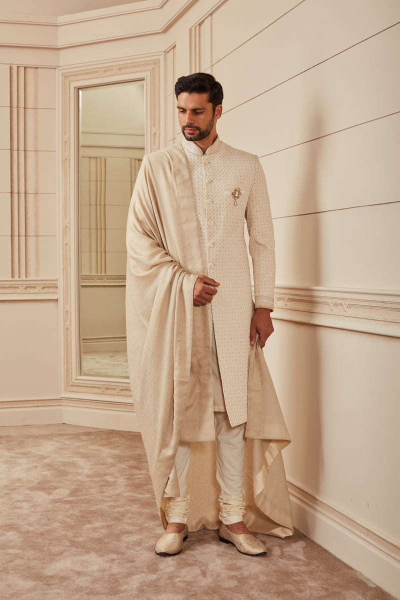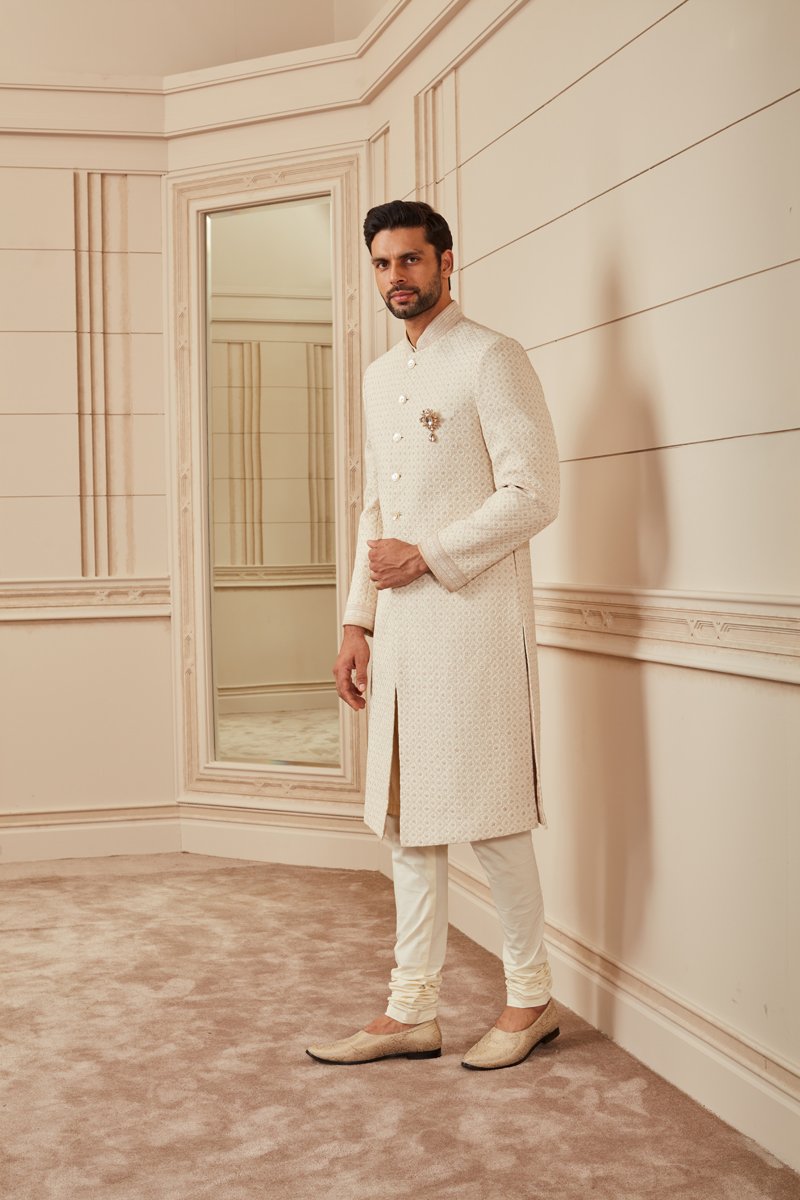 Nothing compares to a tastefully-designed wedding look that is as stylish as it is uncomplicated. Just like this quilted sherwani in a shade of ivory. Embroidered throughout, it is highlighted with dori work all over and features matching buttons in the front. Complete the ensemble with an ivory kurta and churidar pants and offer a subtle contrast with beige juttis and a printed pocket square.