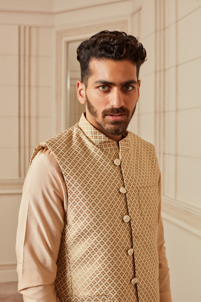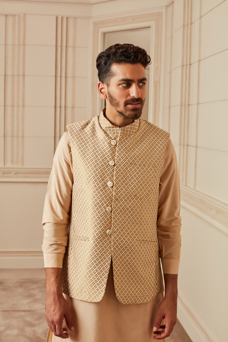 Take your regular festive outfit slightly up a notch with a subtle pattern. Just like in our beige bundi in brocade fabric. Featuring metallic buttons, the jacket looks best when worn with a light gold kurta and churidar set. Complete the ensemble with a pair of two-toned leather and brocade moccasins.