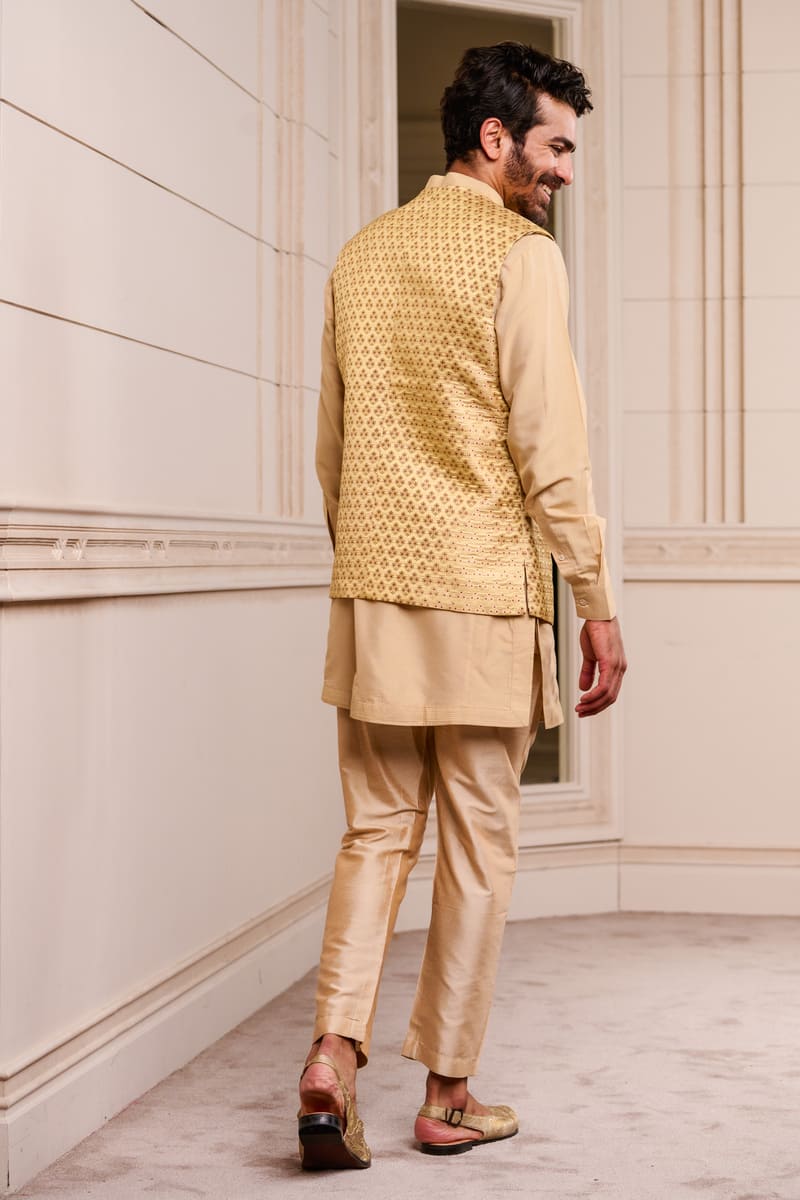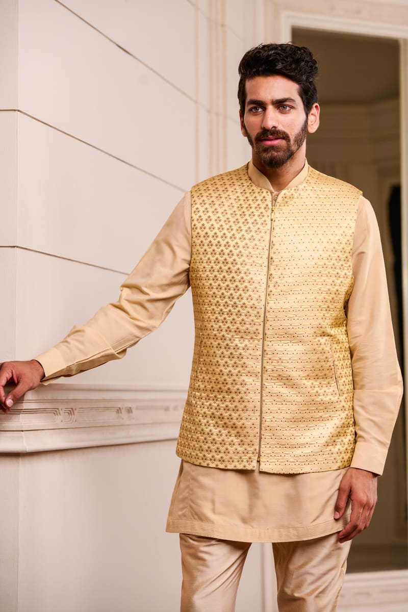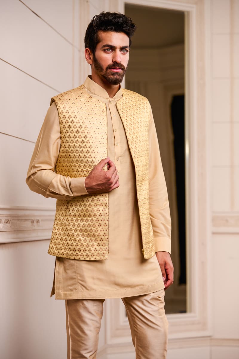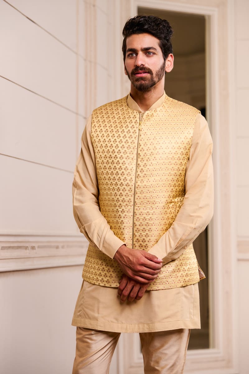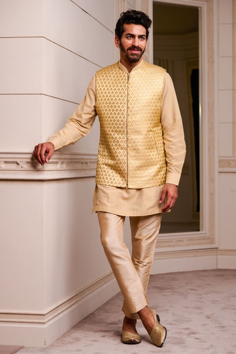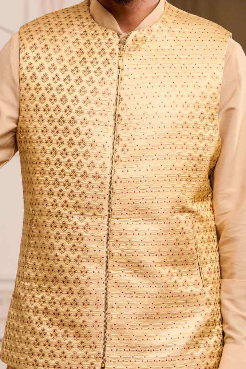 Beige Brocade Kurta Bundi Set