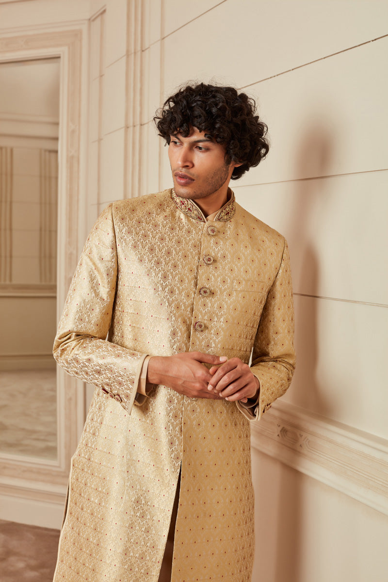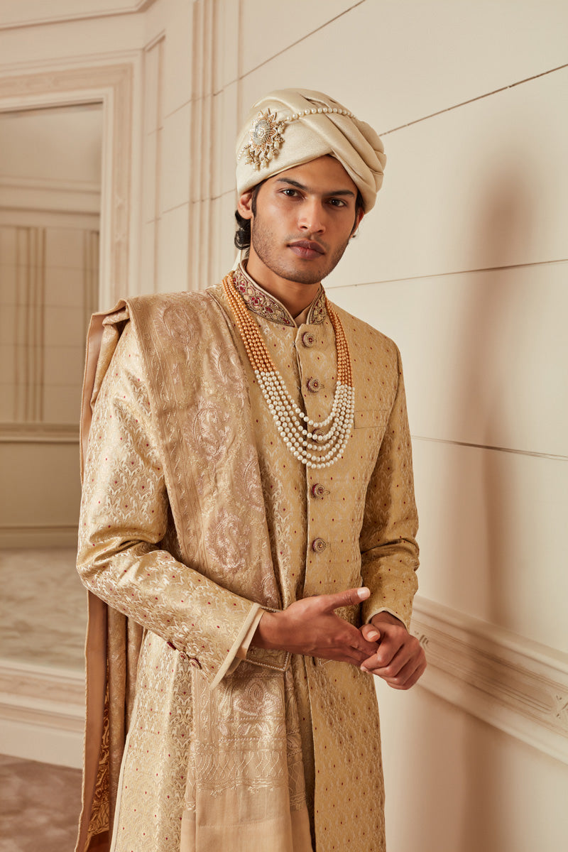 When a shining gold look takes over the ensemble, tone it down by combining it with a neutral shade. Just like in this beige-gold sherwani that is embroidered all over. Enhanced with zardozi embroidery on the collar as well as the buttons, the piece stands out when paired with a matching gold kurta and churidar set. Finish the look with a pair of gold brocade juttis and a princely turban. Ornate jewels take the look to the next level.