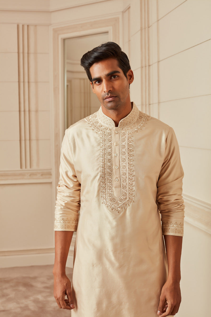 There are few things that can match the charm of a classic silk kurta. For that, take cues from this beige-coloured kurta.. It features intricate thread embroidery around the placket, on the collar and the cuff. Wear it with gold-shaded churidar pants that offer a slight contrast, and a pair of gold brocade moccasins.