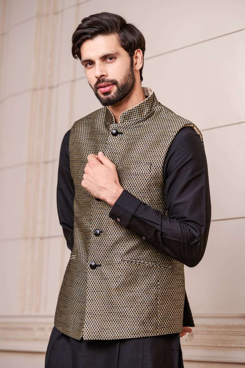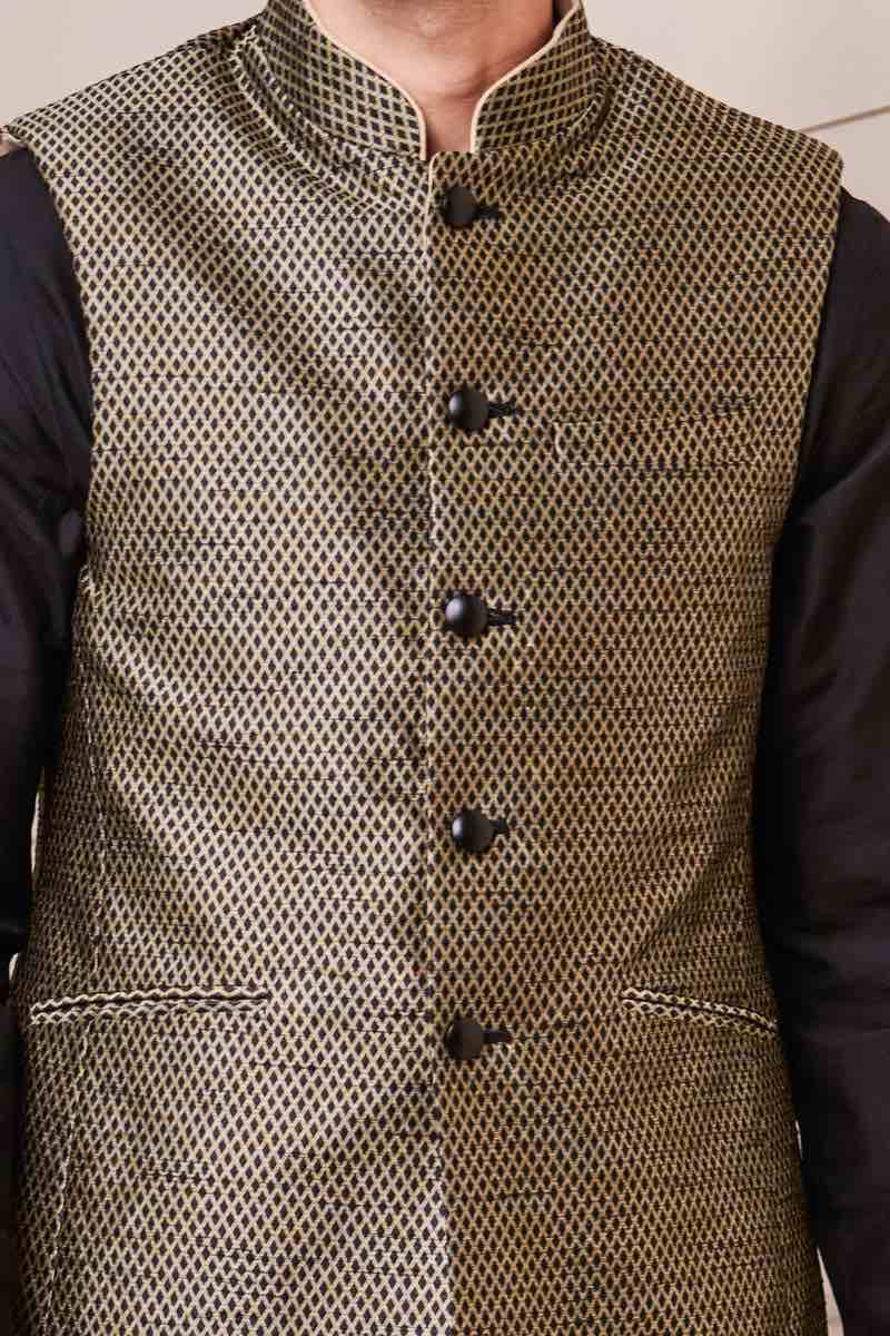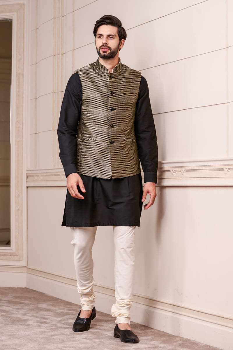 A bundi jacket in a contemporary brocade fabric, with a geometric pattern. The interplay of gold and black give this jacket a modern mesh-like appearance. A streamlined and minimalistic look, make this the ideal groomsman's outfit.