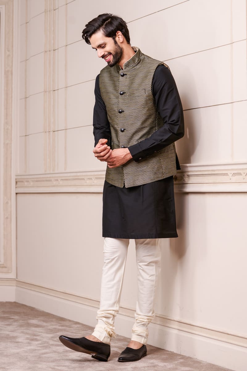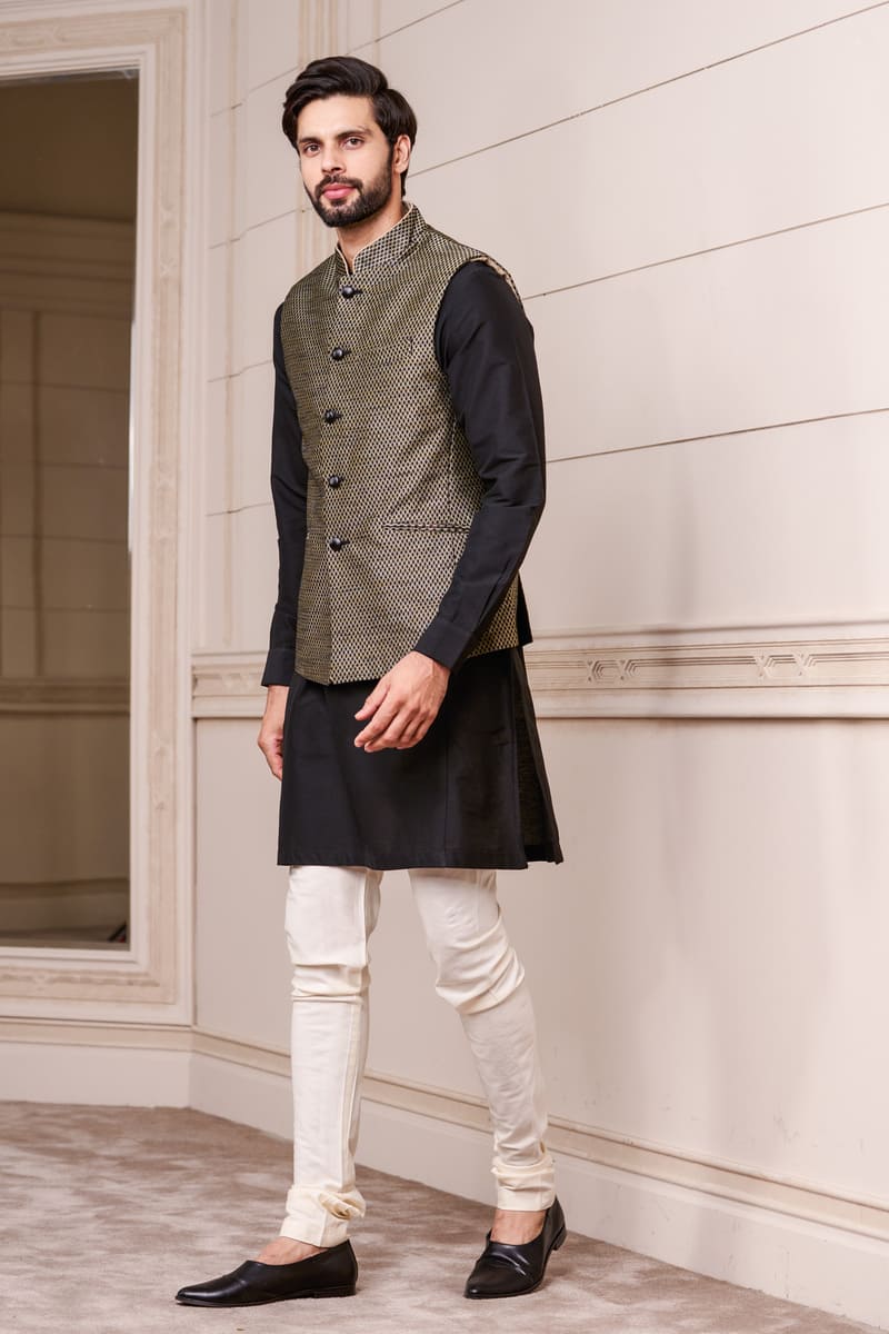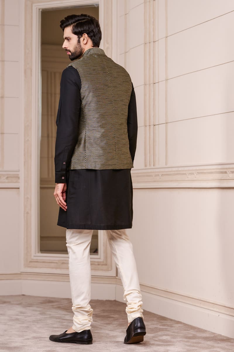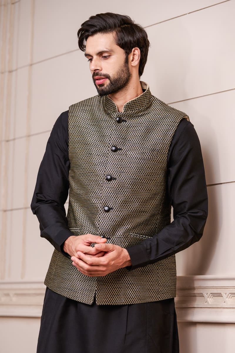 A bundi jacket in a contemporary brocade fabric, with a geometric pattern. The interplay of gold and black give this jacket a modern mesh-like appearance. A streamlined and minimalistic look, make this the ideal groomsman's outfit.