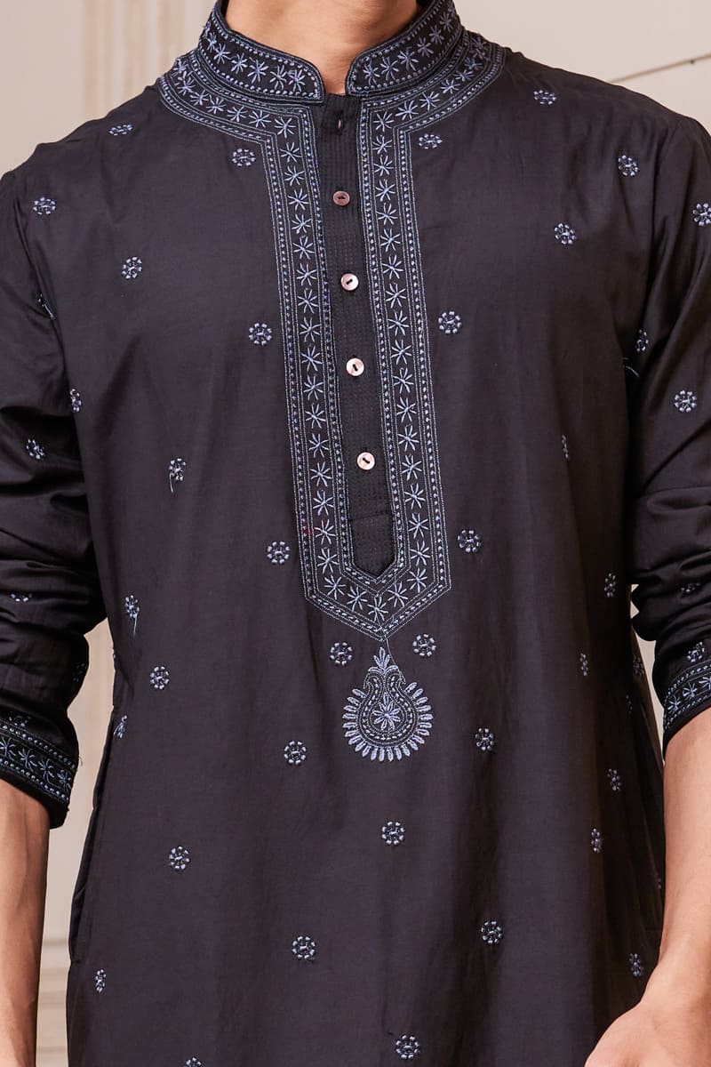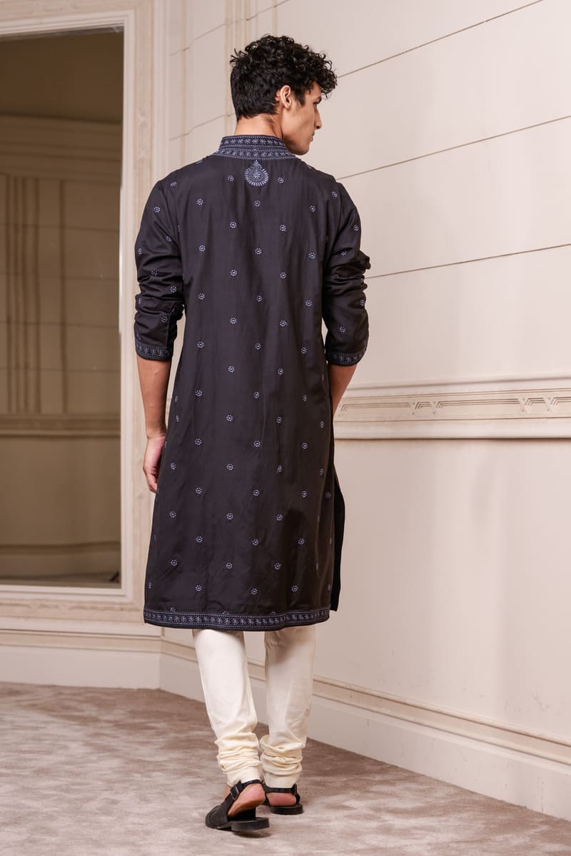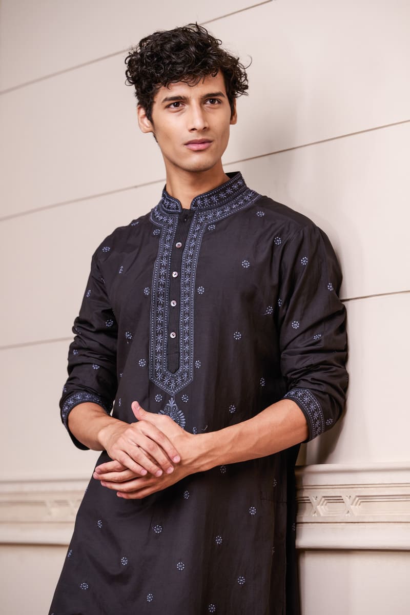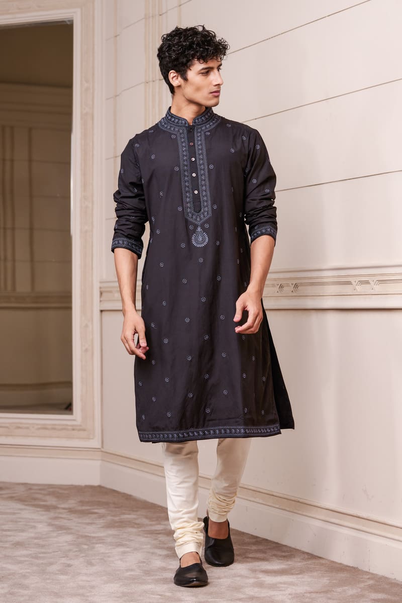 A kurta set in cotton silk,with an ivory churidar.The kurta has all over chikankari embroidery in ivory and beige.A fresh take on the traditional chikankari kurta, this ensemble hits all the right notes for evening events.