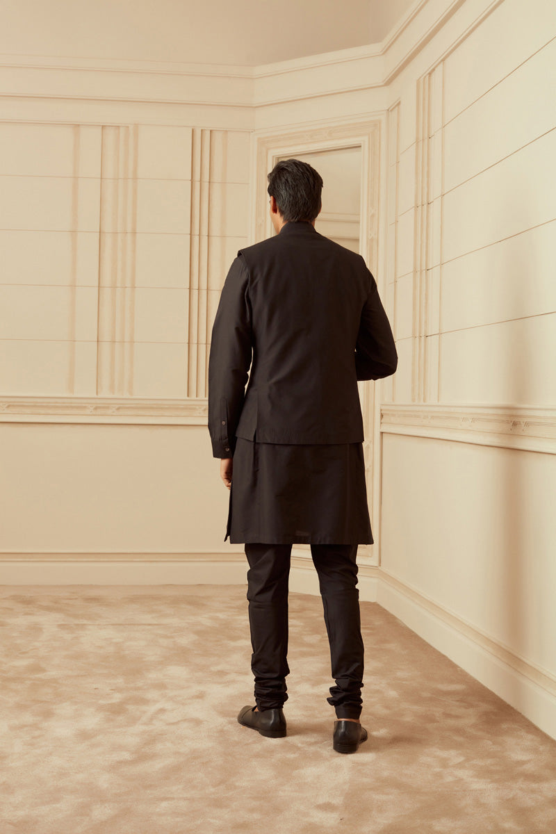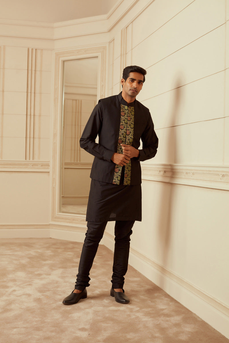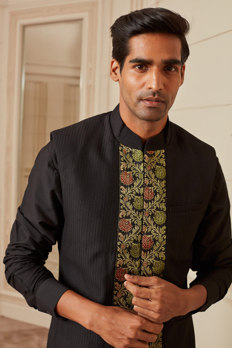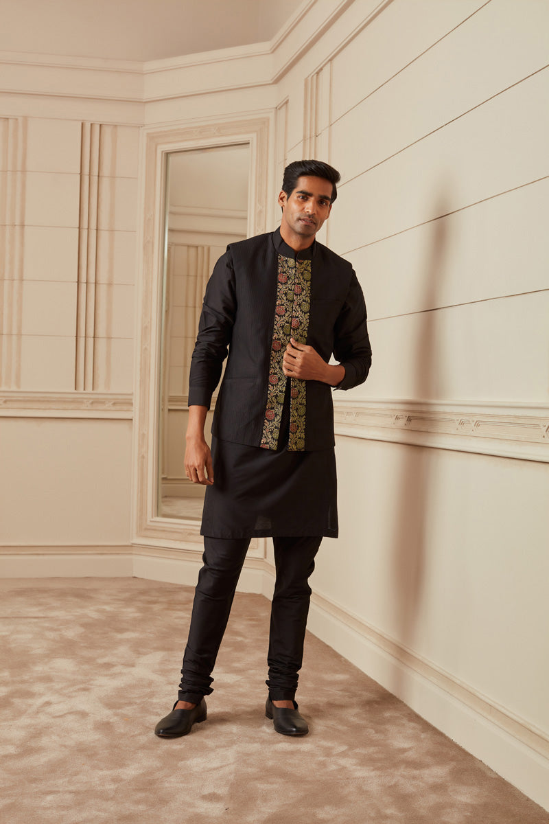 Give your dark tonal ensemble a festive makeover with this jet black bundi that features a contrasting floral-embroidered placket. Embroidered in subtle threadwork all over, the jacket looks best when worn with a matching black kurta and churidar set. Keep the look monochromatic with a pair of black leather juttis. A handsome look without even trying.