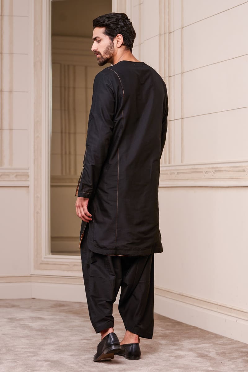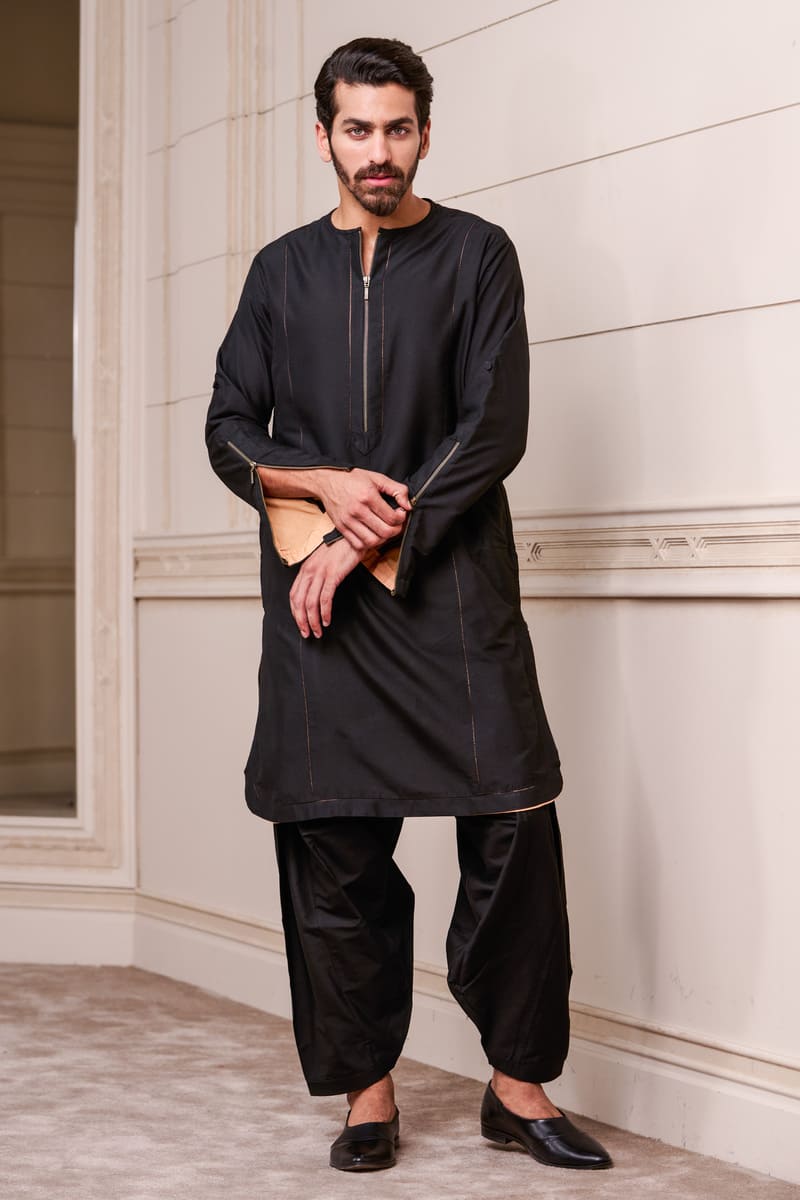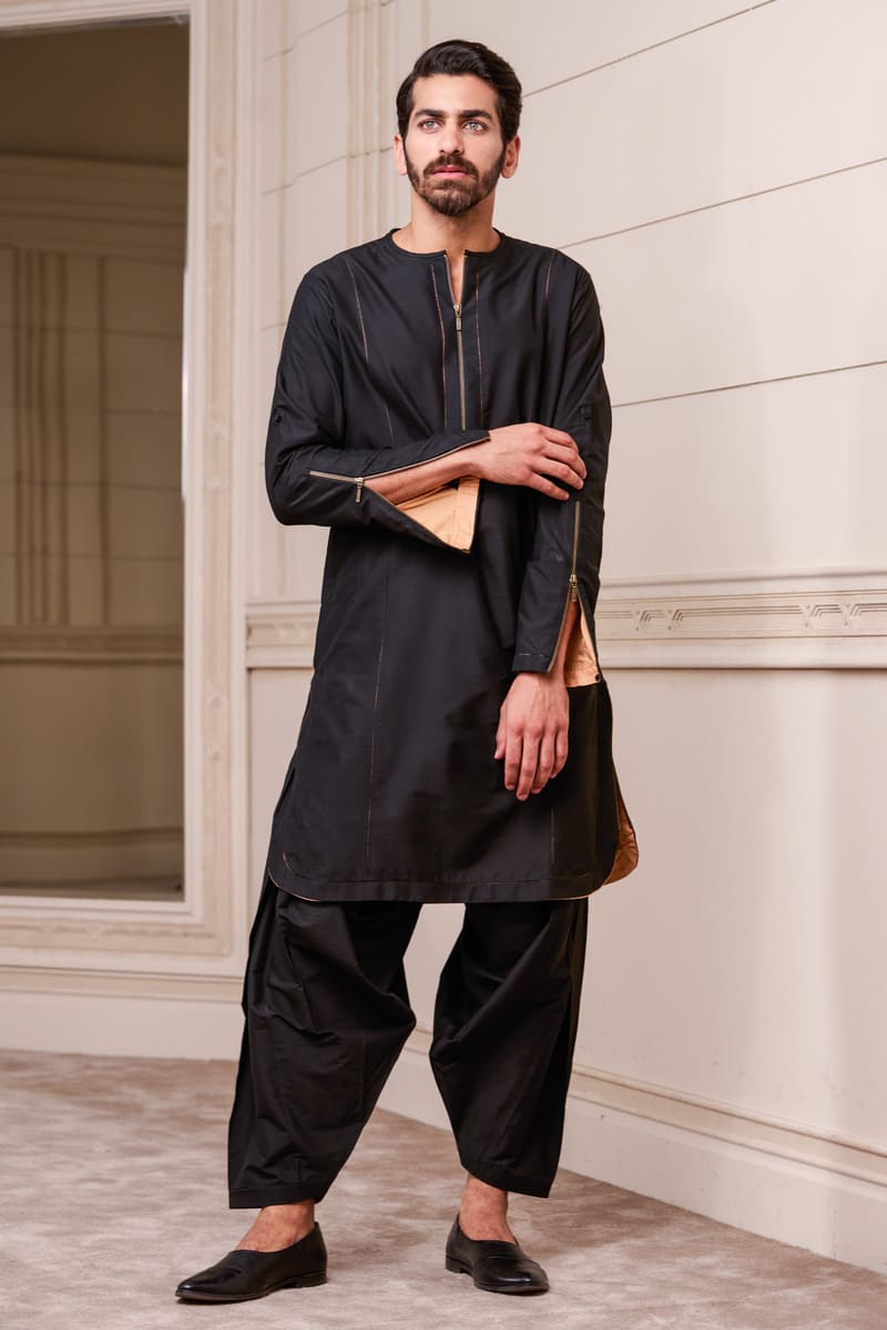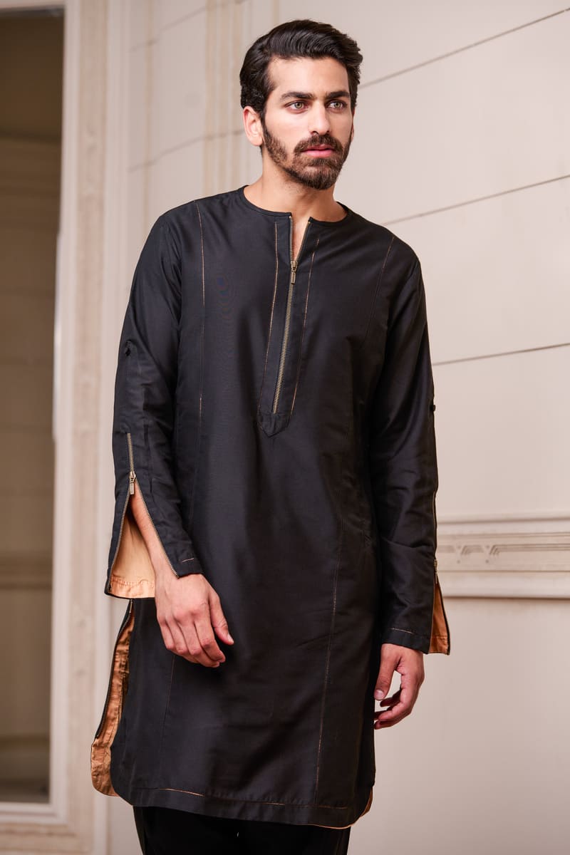 When colour is introduced to a dark tonal outfit, it automatically makes the look stand out. Just like in our black kurta with a contrasting orange lining. The piece features jaali detail along with a sleeve pocket with zipper attachment. Pair it with loose salwar pants and woven black sandals to let the hint of colour catch the eye.