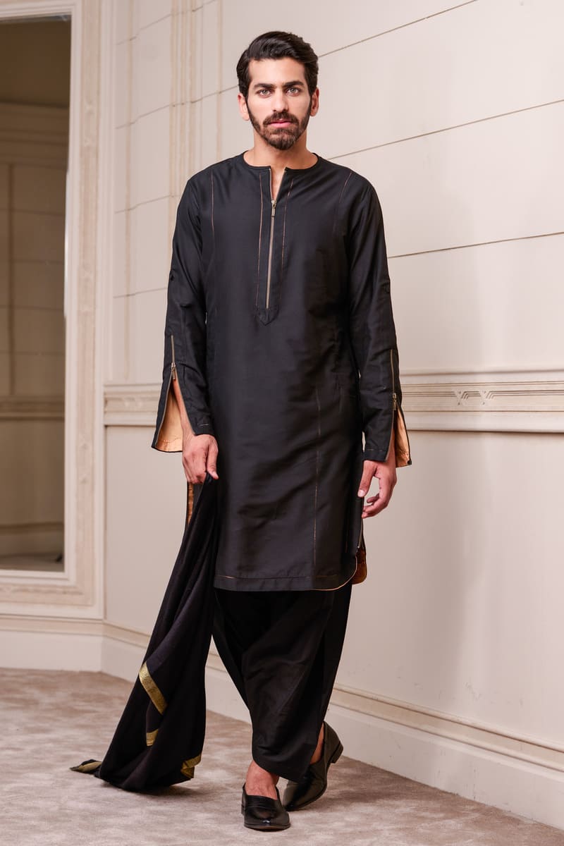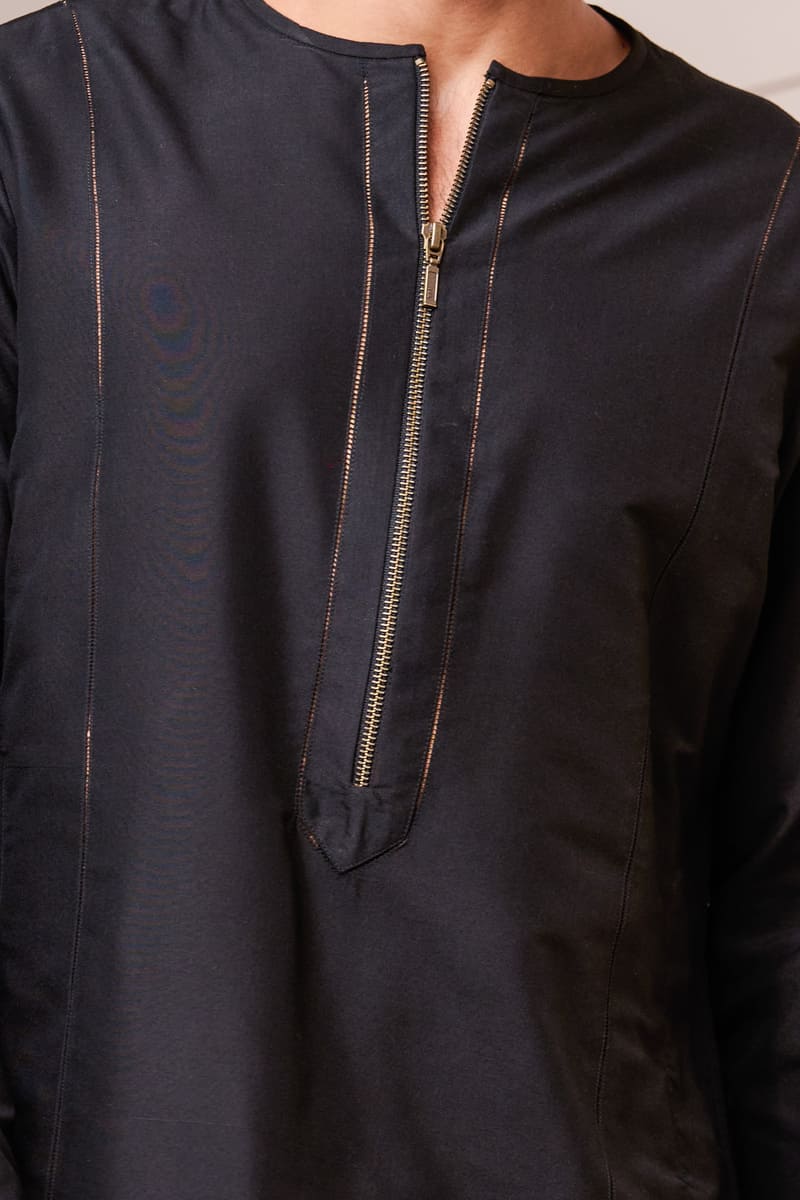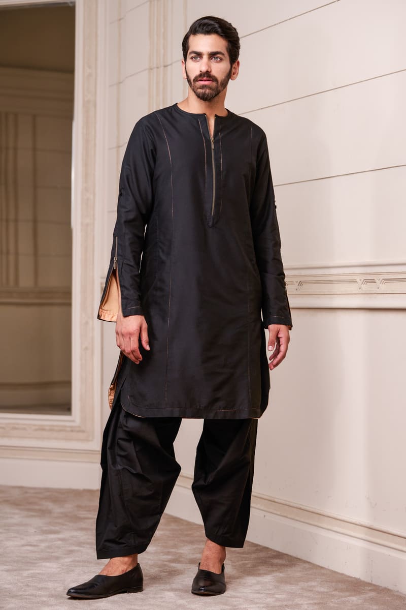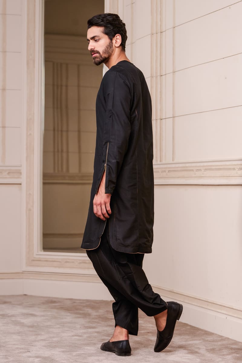 When colour is introduced to a dark tonal outfit, it automatically makes the look stand out. Just like in our black kurta with a contrasting orange lining. The piece features jaali detail along with a sleeve pocket with zipper attachment. Pair it with loose salwar pants and woven black sandals to let the hint of colour catch the eye.