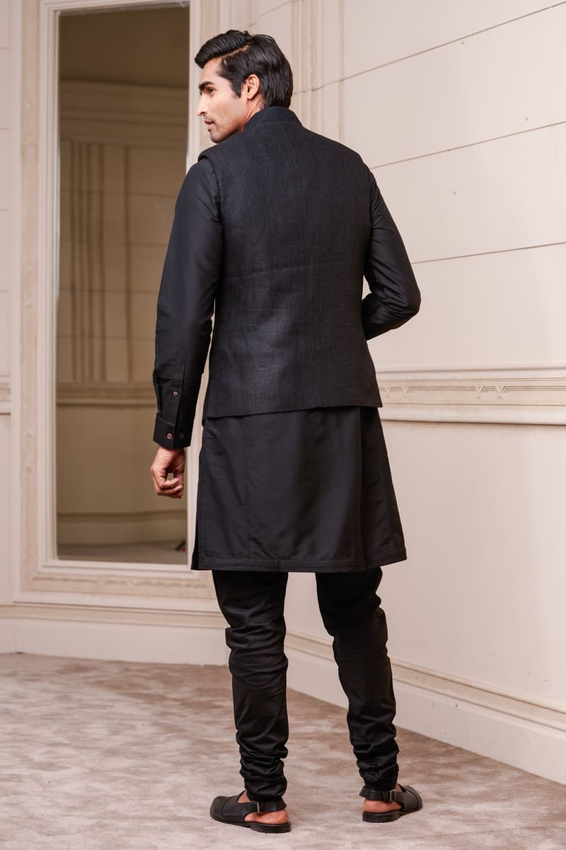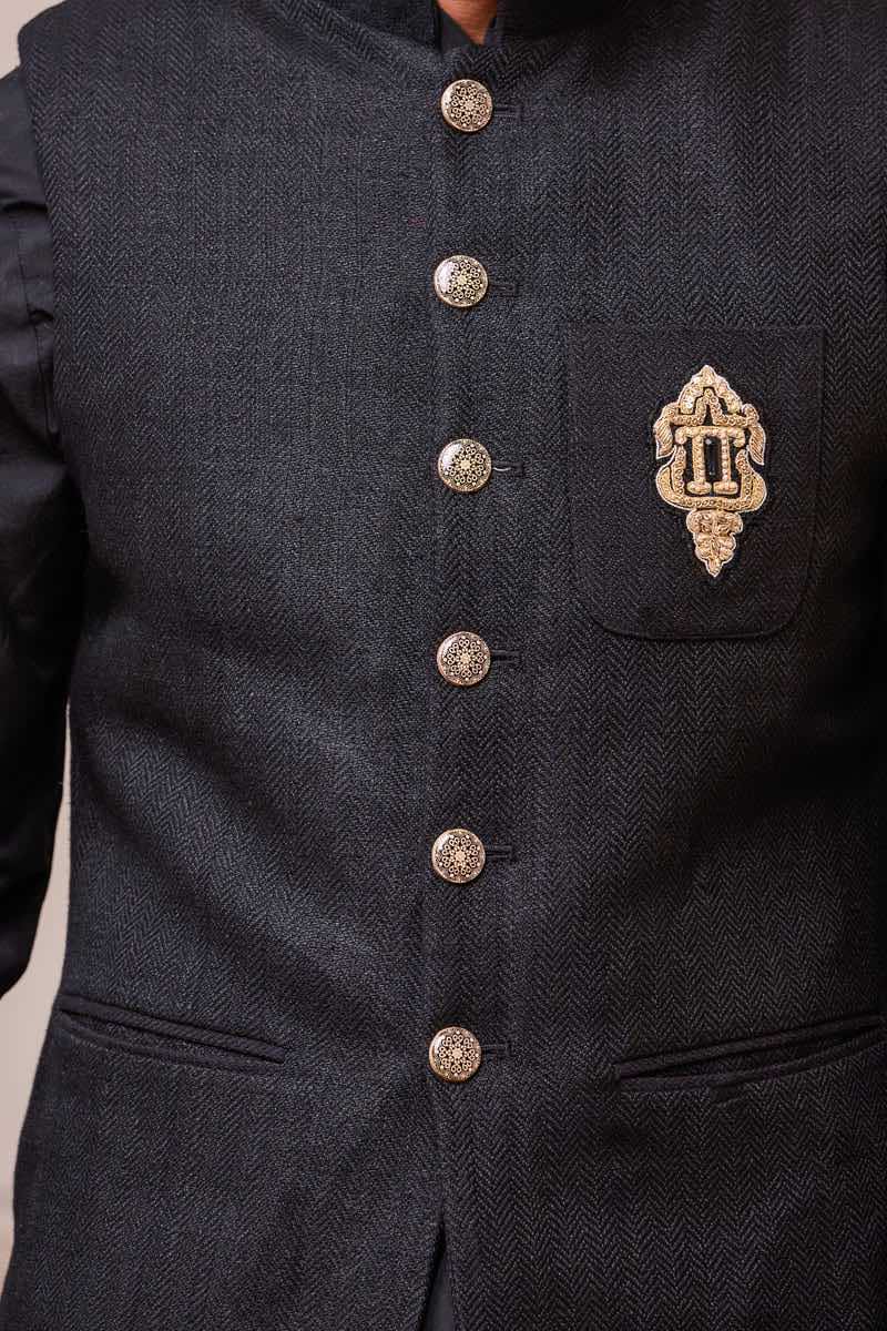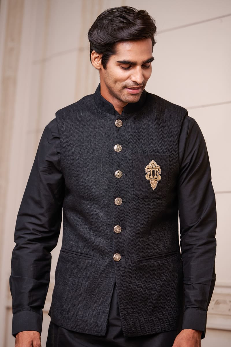 Reminiscent of royalty, this black bundi jacket is embellished with zardozi embroidery and gold detailing. A stylised crest motif, embroidered on the front pocket, catches the eye and highlights the beautiful craftsmanship. Gold metallic buttons and gold edging complete the look. Make it an all black ensemble with a kurta set or create some drama and use the black as a sharp contrast with an ecru or cream kurta.