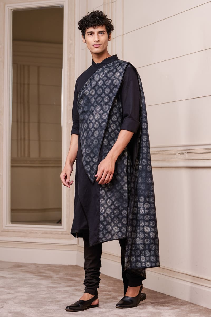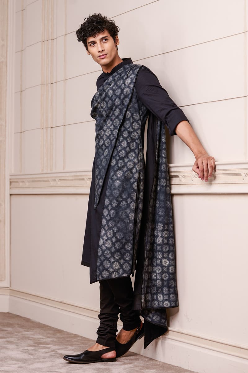 An ode to youth, this kurta set is not for the shy.A printed,draped and panelled kurta in khadi paired with classic black churidars, make this ensemble a must have for any fashion fanatic.