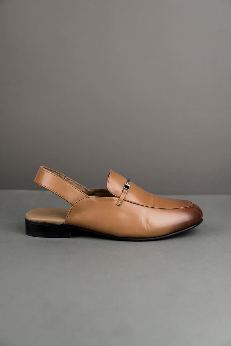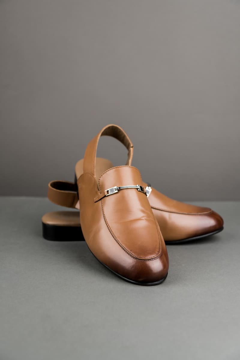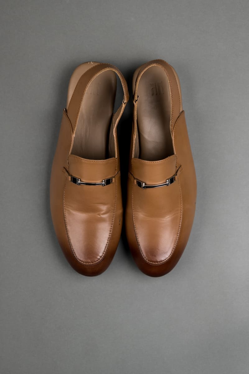 An easy and comfortable pair of shoes is a must for running around in during wedding events. For that, go for these black leather loafers in a slingback style with metal detailing on top.