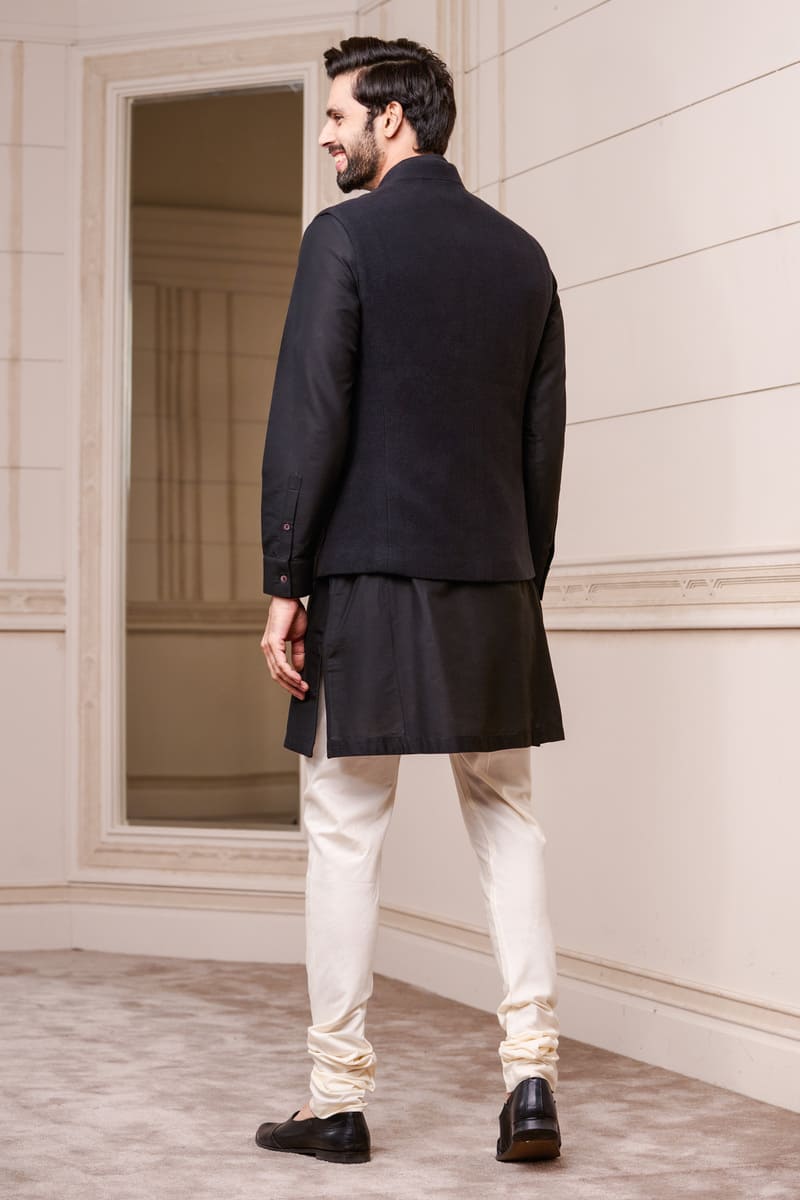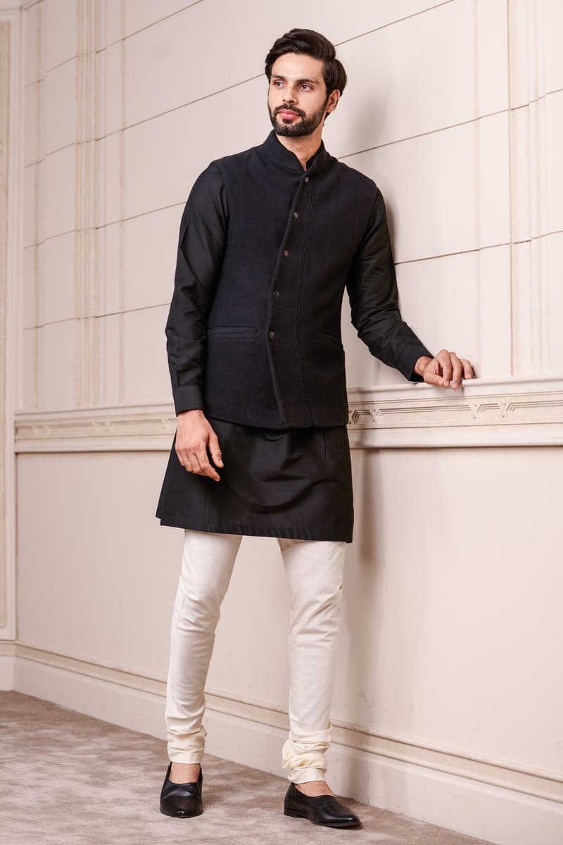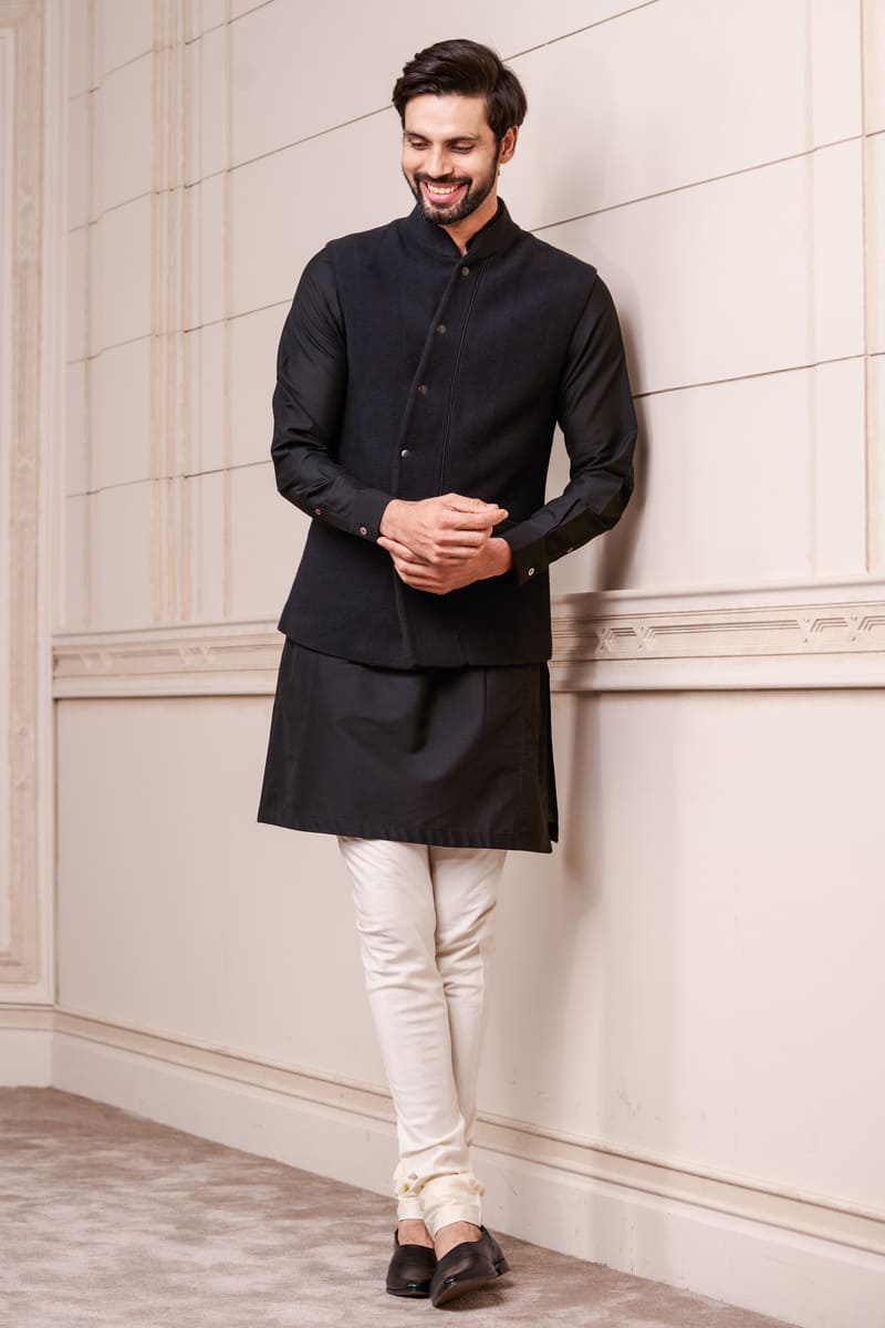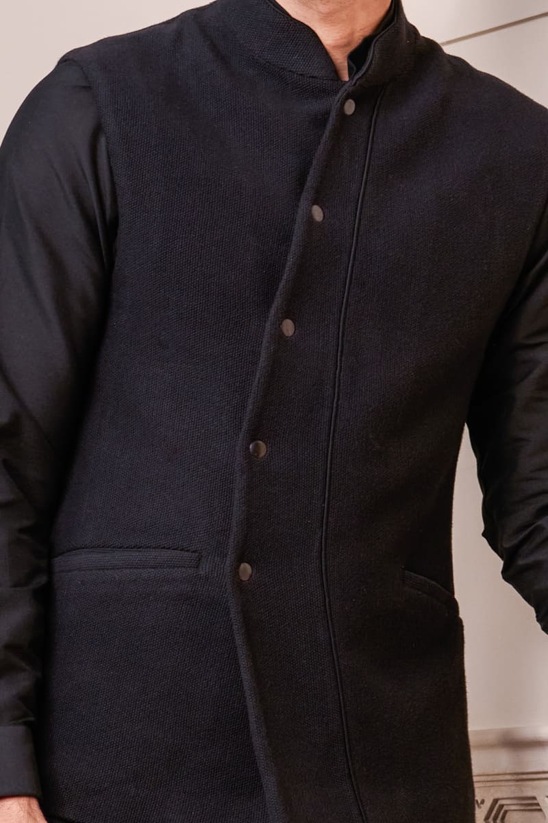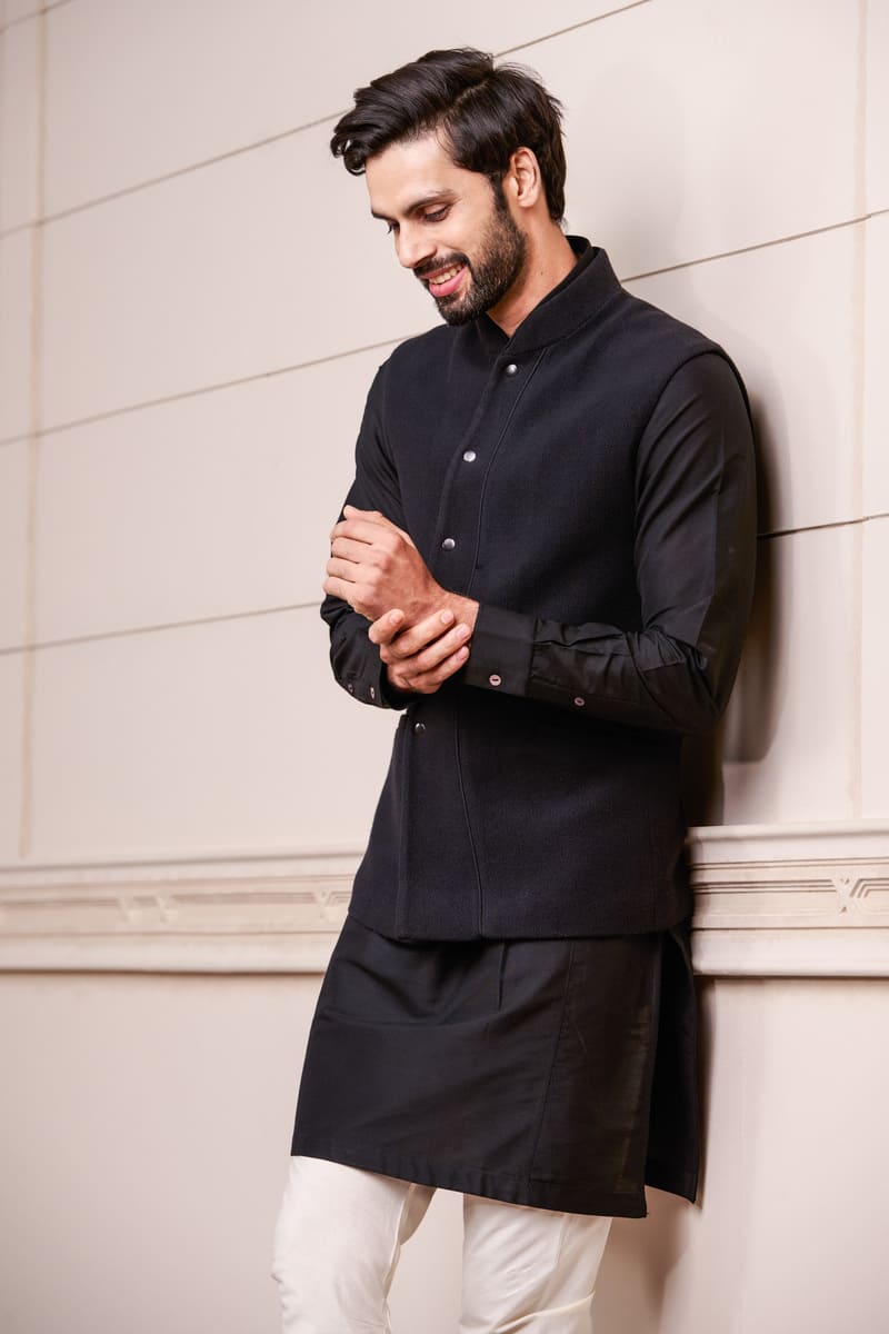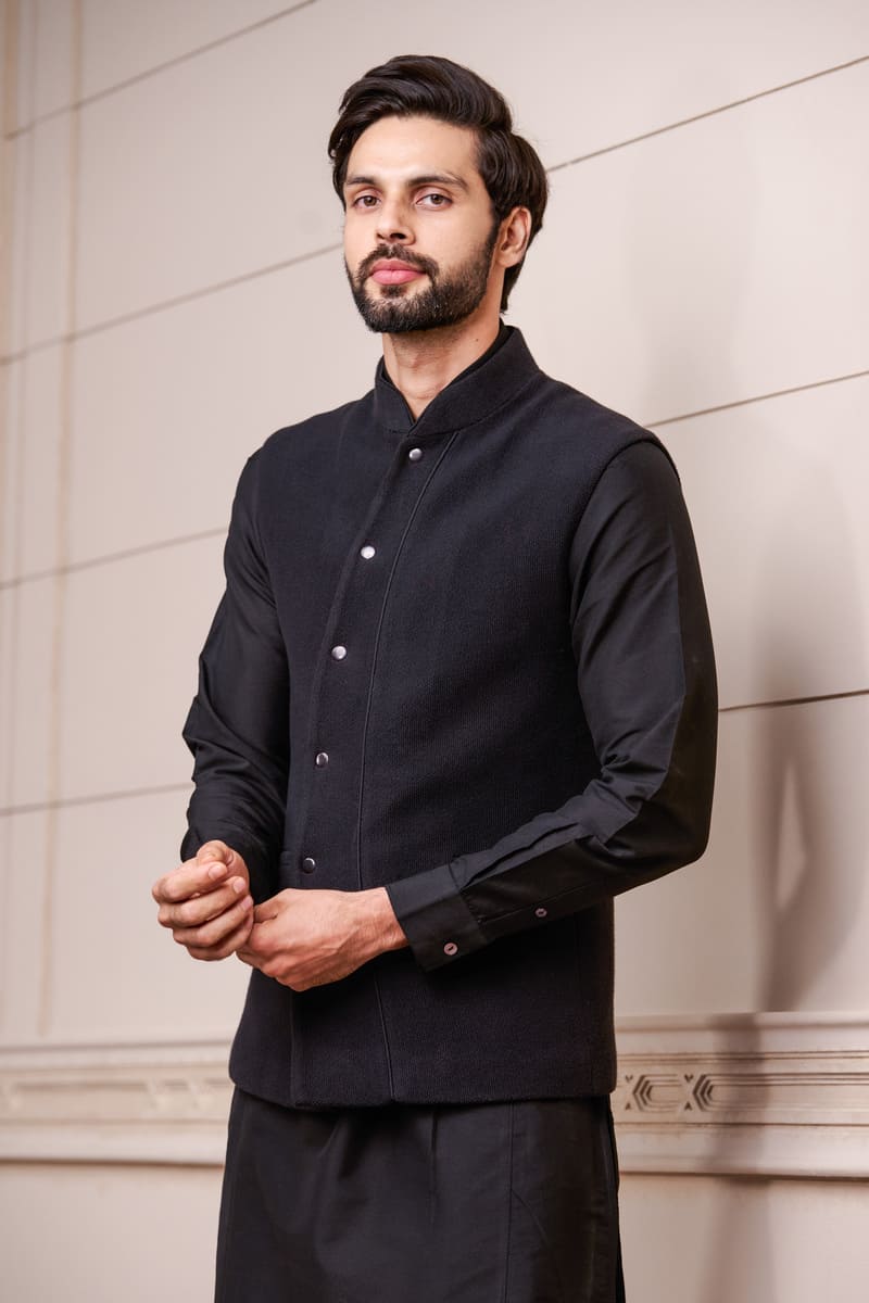 A bundi jacket in classic black, in a knit/pique fabric. This jacket has satin detailing and expert craftsmanship, made to fit any body type. Wear it with a Black kurta and coordinating bottoms for a fun update on traditional wear.