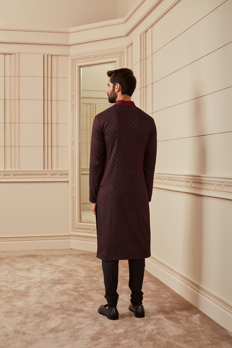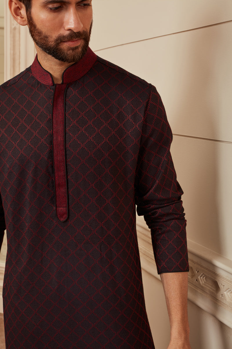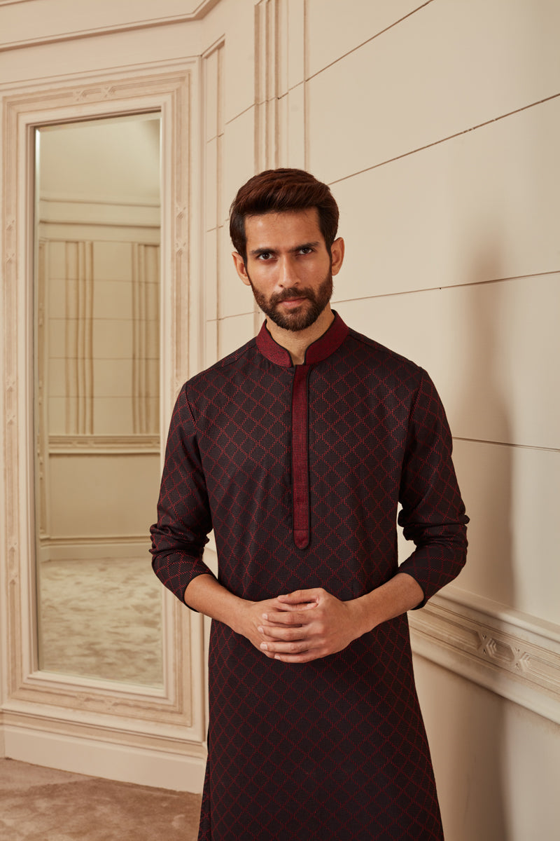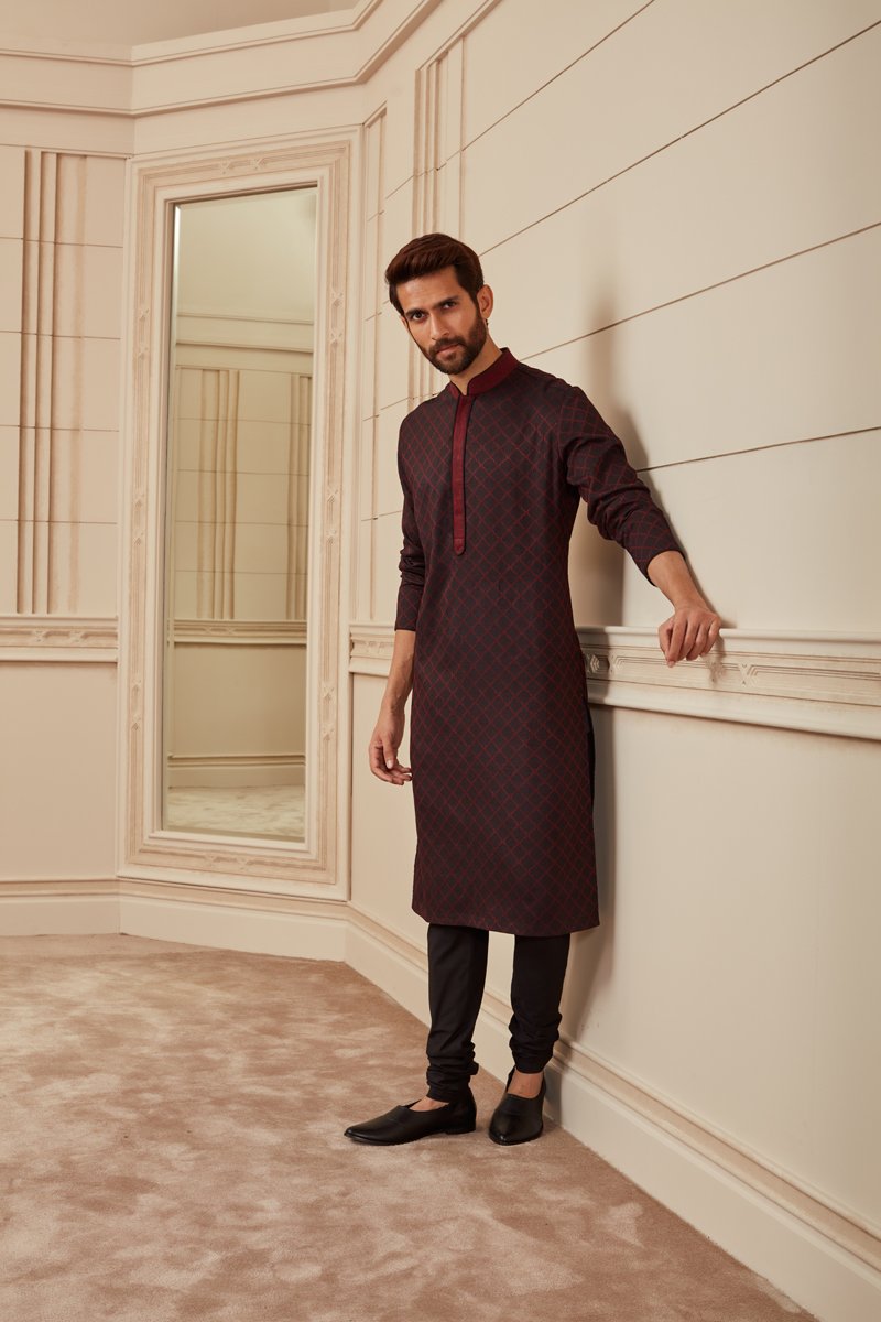 Donning a statement kurta that is comfortable yet stylish at your best friend’s wedding function is a smart decision. Just like with our long black kurta that is textured with contrast maroon detailing and pattern all over. It features a top-stitched collar and placket that offers a pop of colour. Pair it with a pair of plain black churidar pants and wear easy black mojris to help in all the running around.