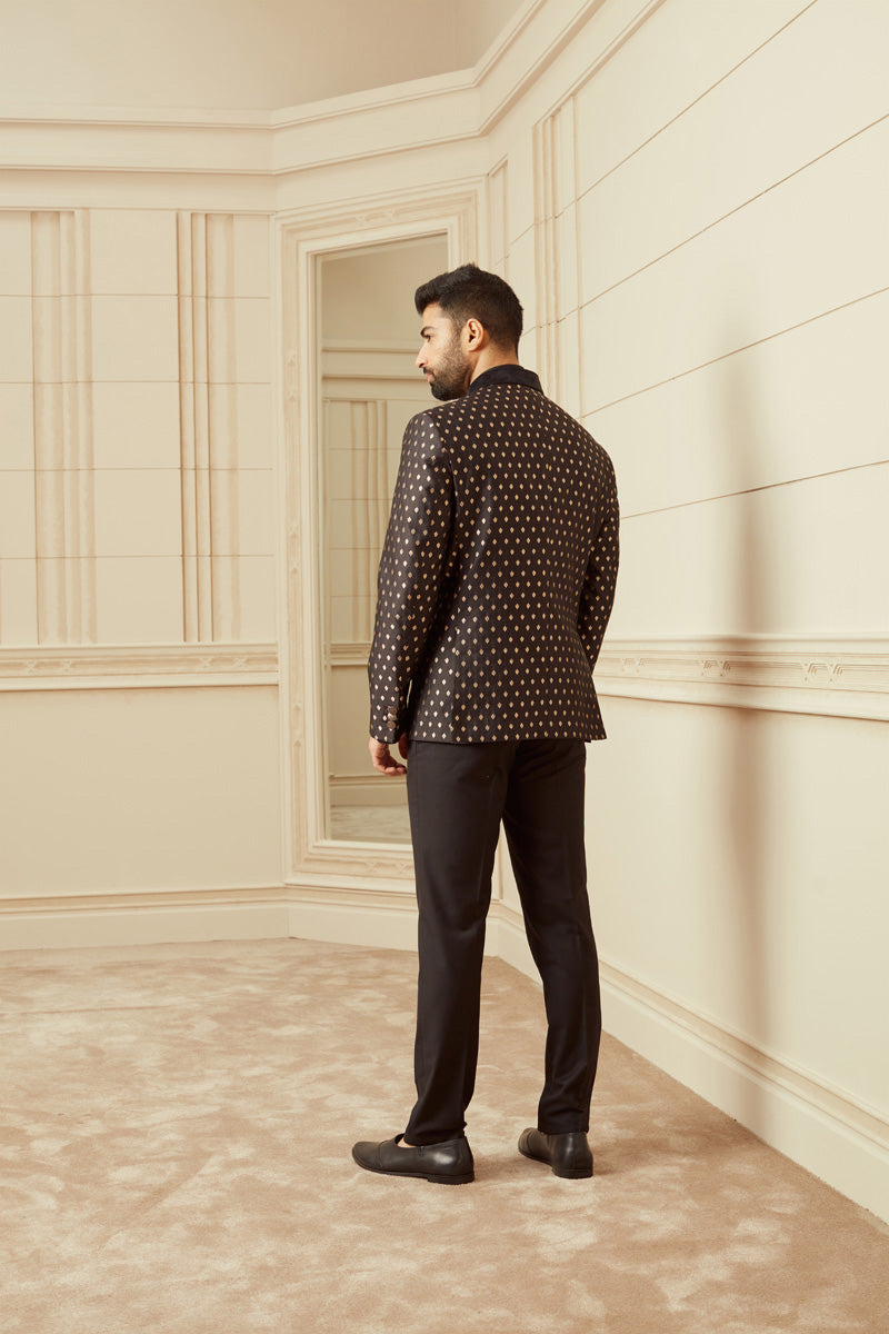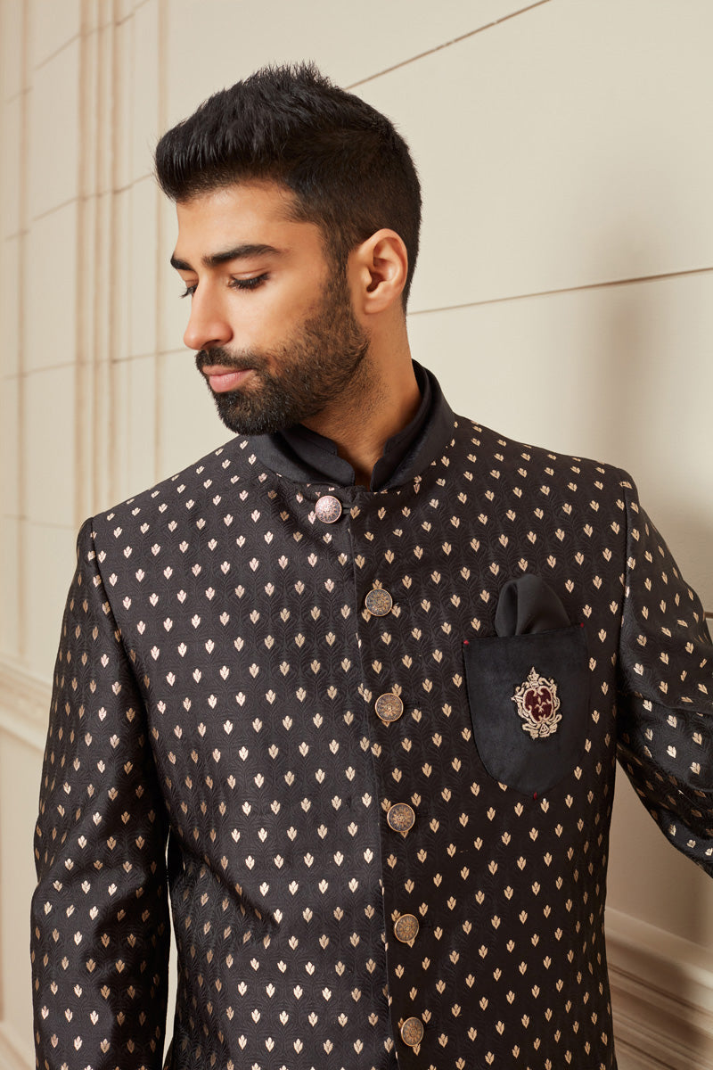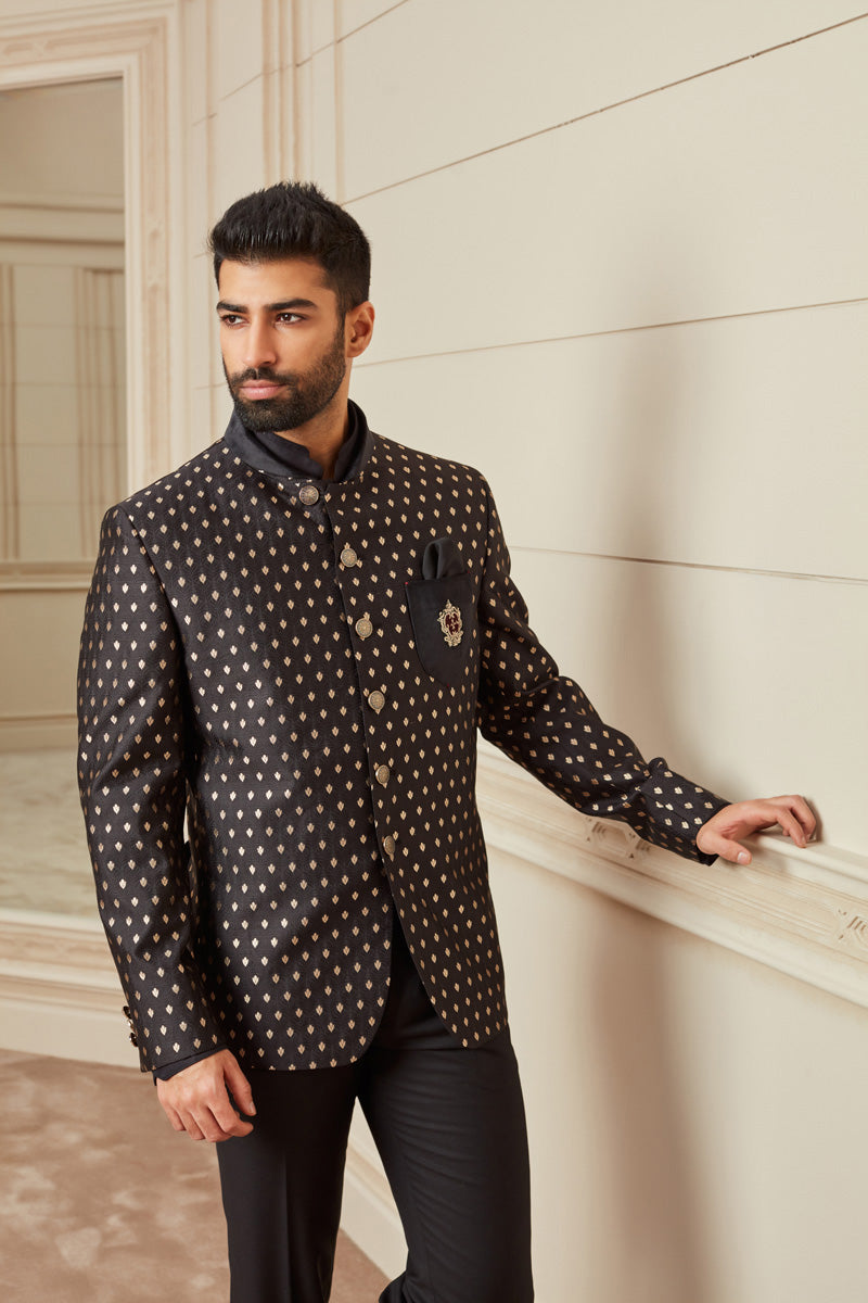 Give in to the appeal of a classic monotone look with this black bandhgala in brocade fabric. Adorned with metallic buttons and featuring a pocket that is embroidered in zardozi, the piece is to be paired with black narrow trousers. Complete the look with a pair of formal leather moccasins. This is as dapper as it gets.
