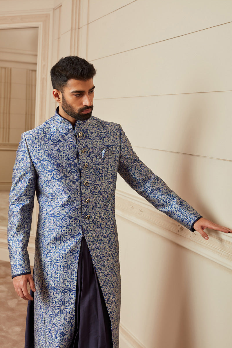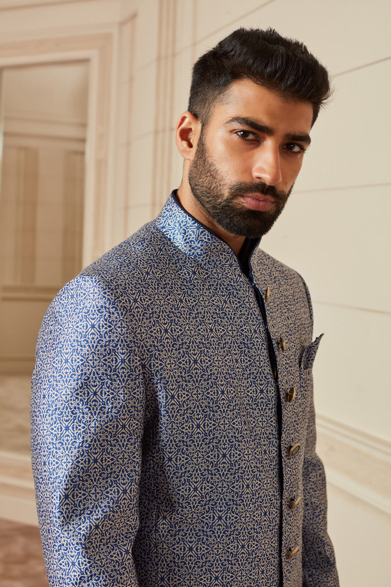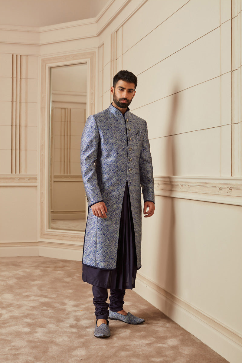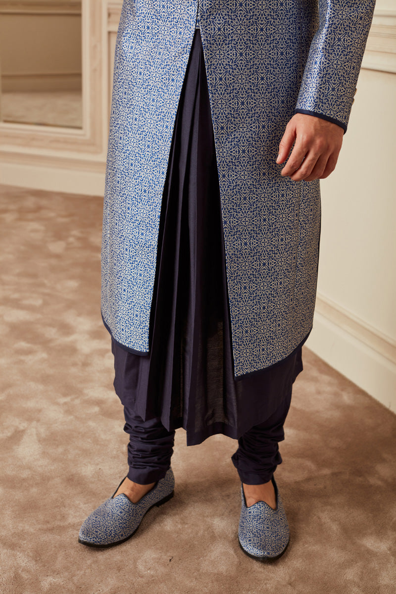 Can’t decide between plain and patterned for your wedding day? Get both in the same outfit with this navy blue sherwani in a busy brocade fabric. It will look best when offset with a navy pleated kurta and churidar set. Complement the whole ensemble with a pair of matching embroidered brocade moccasins.