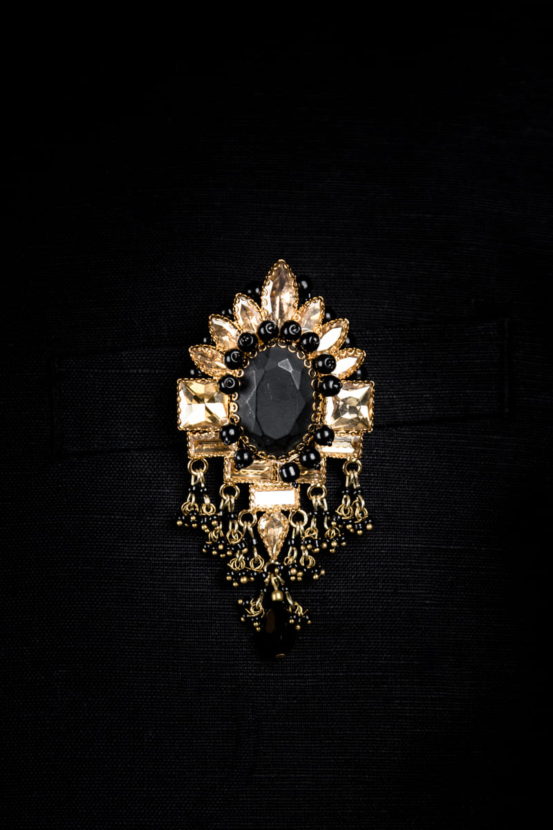 Top off your reception ensemble with this black and gold brooch encrusted with stone and crystals, also featuring a drop detail.