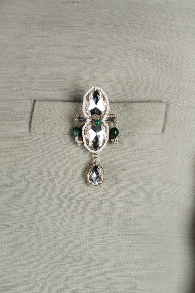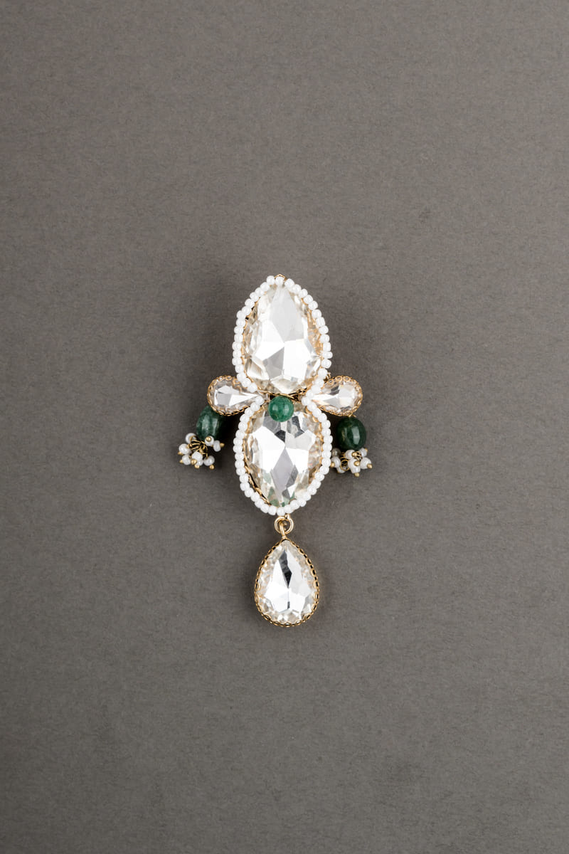 Just the right amount of bling is added to your outfit with this understated brooch encrusted with light green stones and crystals.