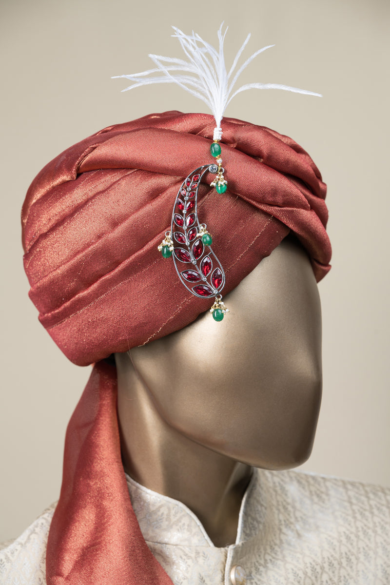 Top off your festive wedding look with this crystal and maroon semi-precious stone sarpech. It is also embellished with emerald stones and features feather detailing.