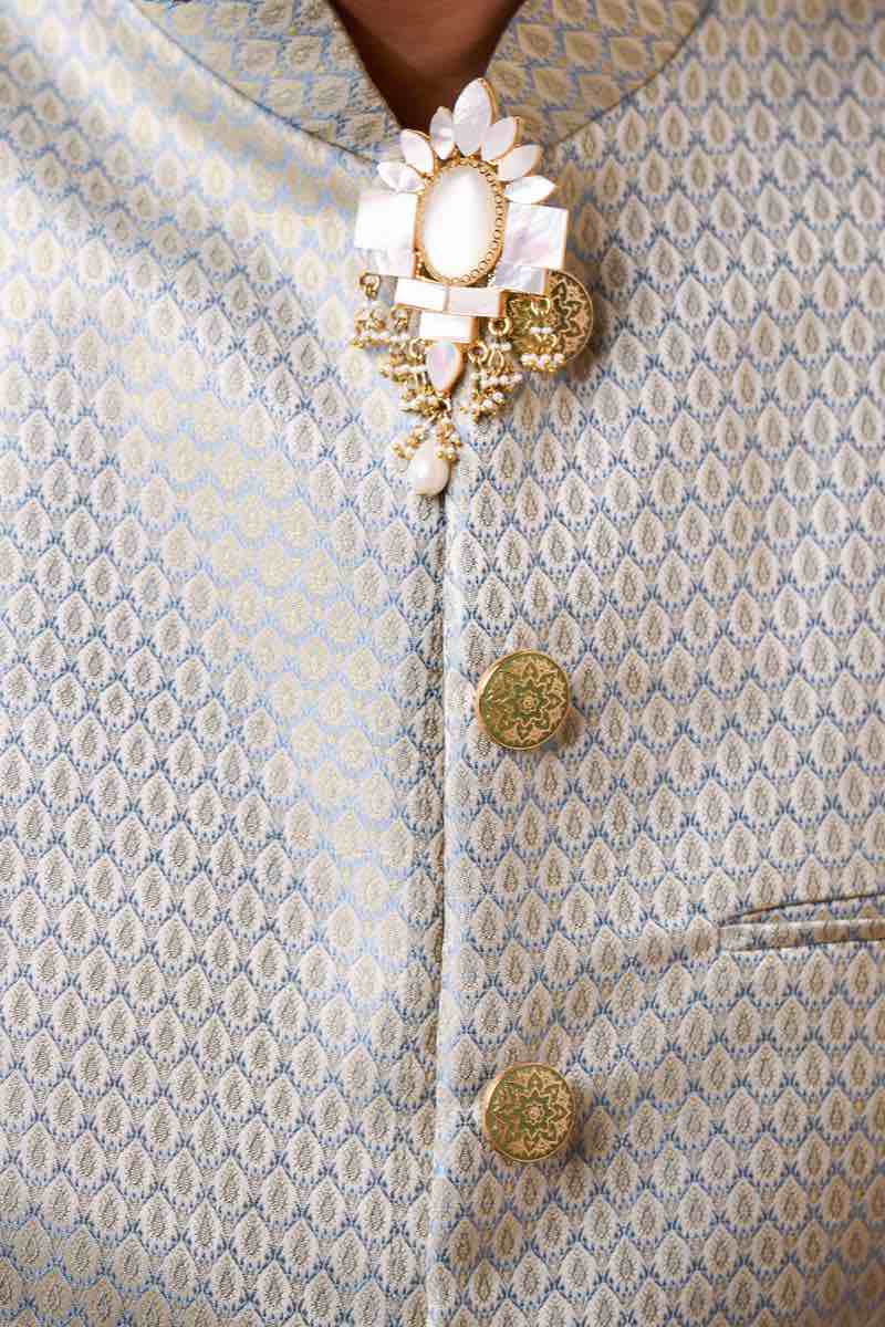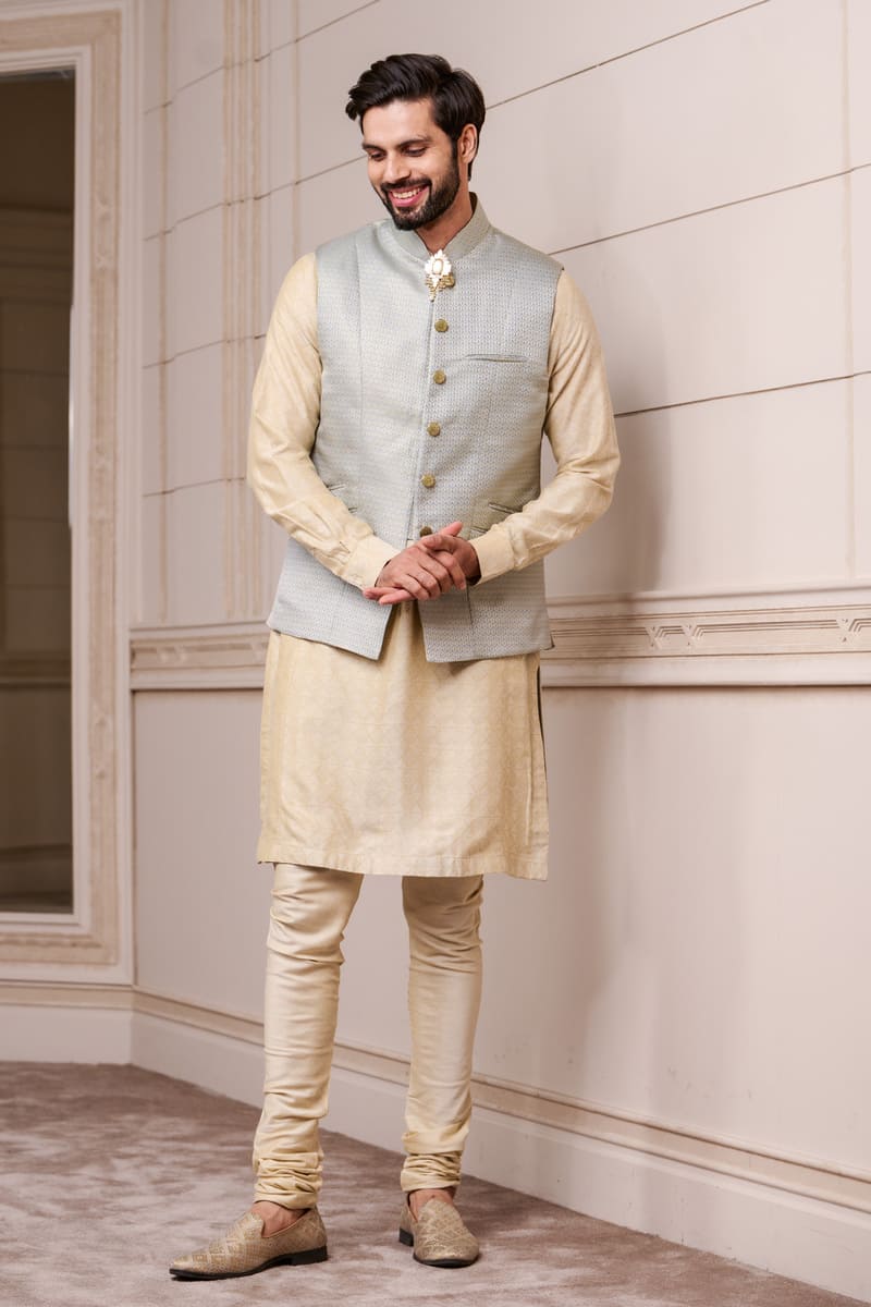 The perfect pair of gold and blue,beautifully shown here in this set. A brocade bundi jacket with enamel motif buttons,double velt pocket details and a slim fit is paired with a contemporary kurta and churidar in jacquard fabric. Add a brooch at the collar for a distinguished touch.