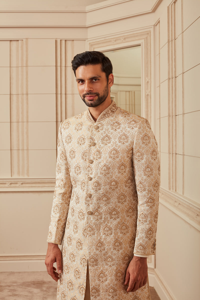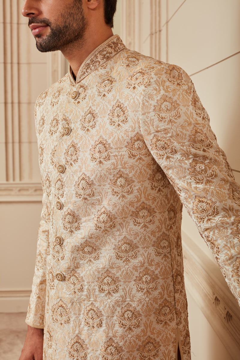 Old-world charm will take over the evening when you wear this embroidered sherwani in sparkling gold for your wedding. Designed in brocade fabric and uplifted with traditional zardozi threadwork all over, it comes alive when paired with an off-white kurta and churidar pants. Keep your footwear simple with matching embroidered juttis.