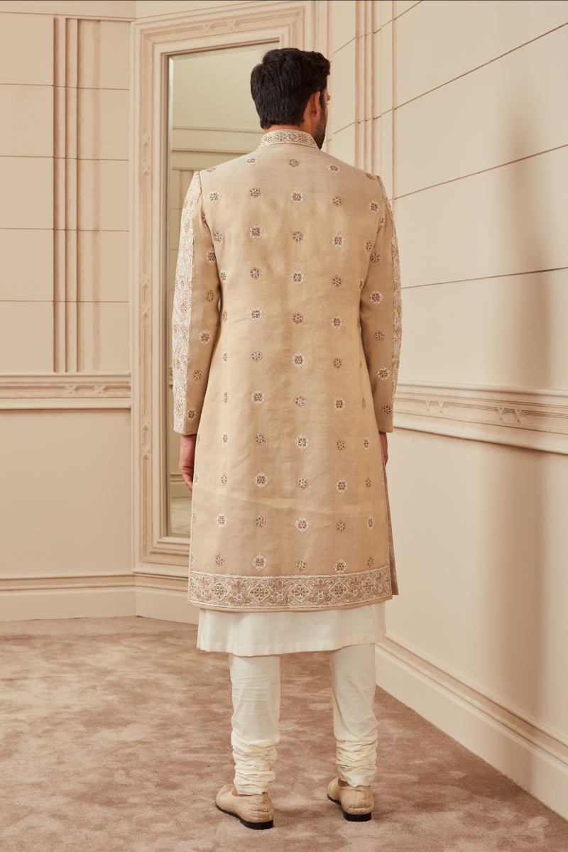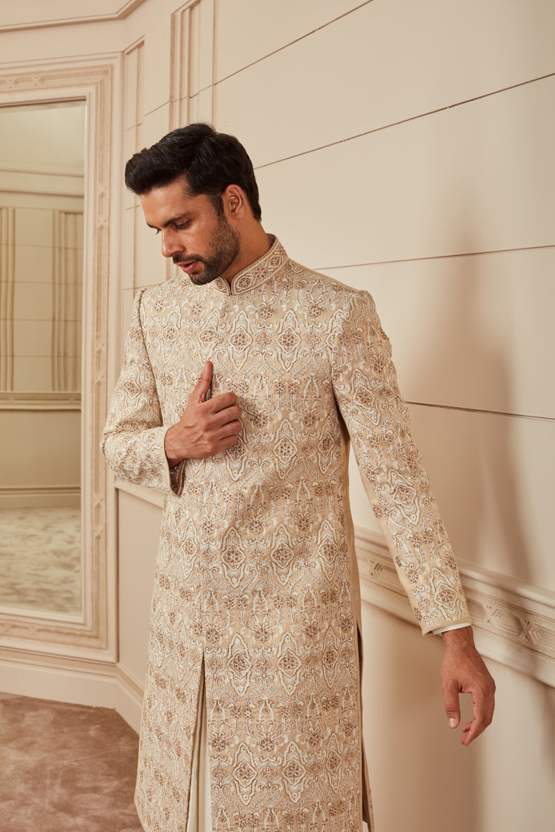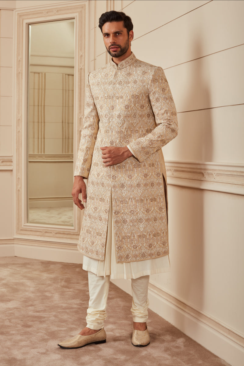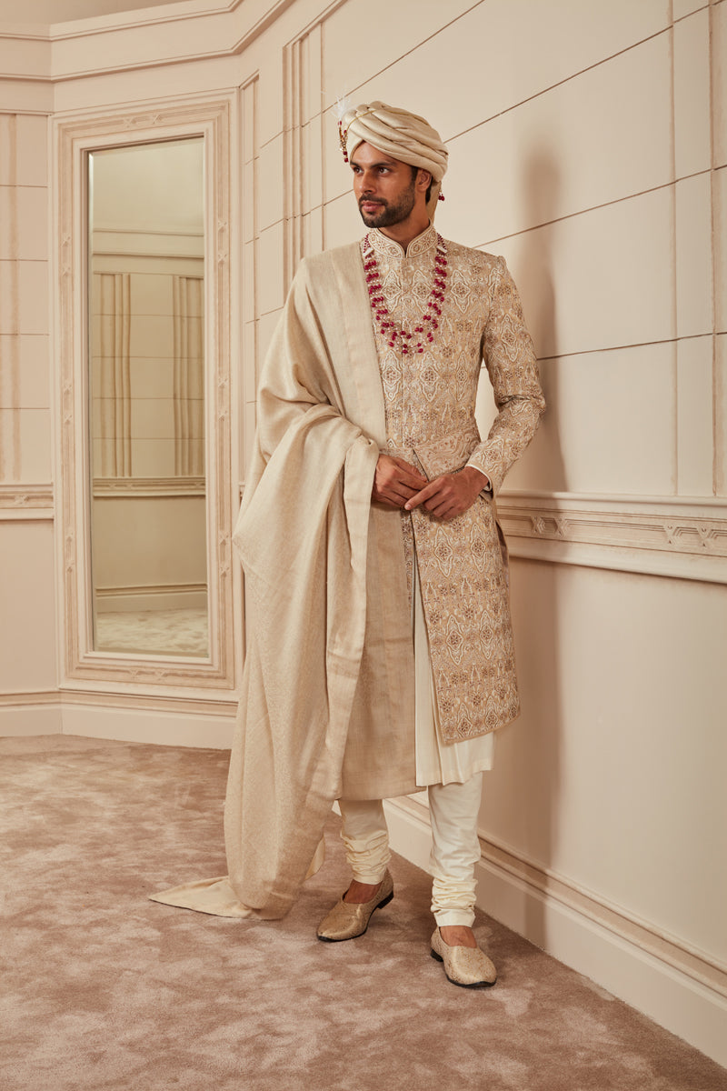 The groom’s outfit should be one that embodies regality and glamour in equal measure. For that, take cue from our sophisticated beige sherwani in tissue fabric. It is intricately embroidered in resham threadwork all over with just the right amount of shine. Wear it with a cream-coloured pleated kurta and churidar set, completing the look with matching brocade mojaris.
