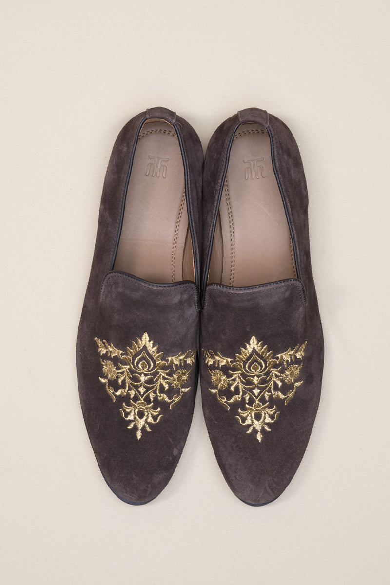 Every man should own a pair of dark-shaded formal shoes that can be used time and again with many outfits. Just like these dark brown velvet moccasins with a gold patch in the front.