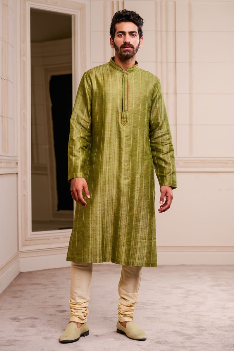 A light green kurta set,with a beige churidar. The kurta is embroidered with a multicoloured top stitch all over the placket.The fabric has a natural slub texture adding an interesting textural element to the style. An easy to pair and wear ensemble for a sangeet or mehendi ceremony.