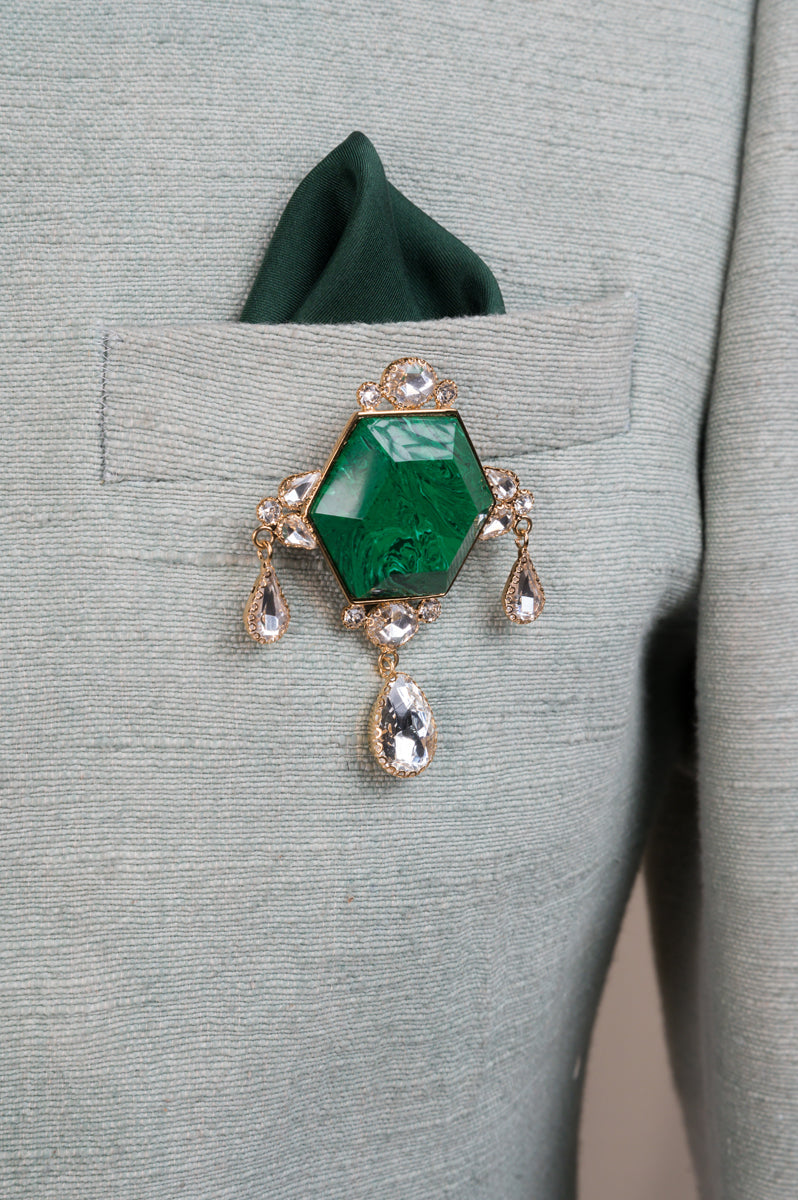 Sometimes, just a delicate accessory is good enough to enhance any outfit. Like this hexagonal emerald brooch that is encrusted with dainty resin and crystals.