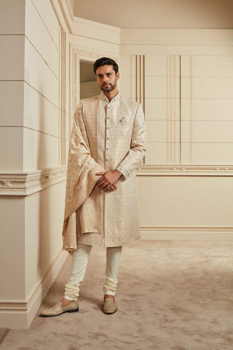 Honour age-old traditional and fashion by opting for this ivory sherwani in brocade fabric for your wedding day. Featuring delicate zardozi embroidery all over, it is also laced with pearls throughout the garment. Pair it with a matching ivory kurta and churidars while enhancing the overall look with an embroidered stole. Keep the shoes in sync with the outfit with embroidered moccasins.