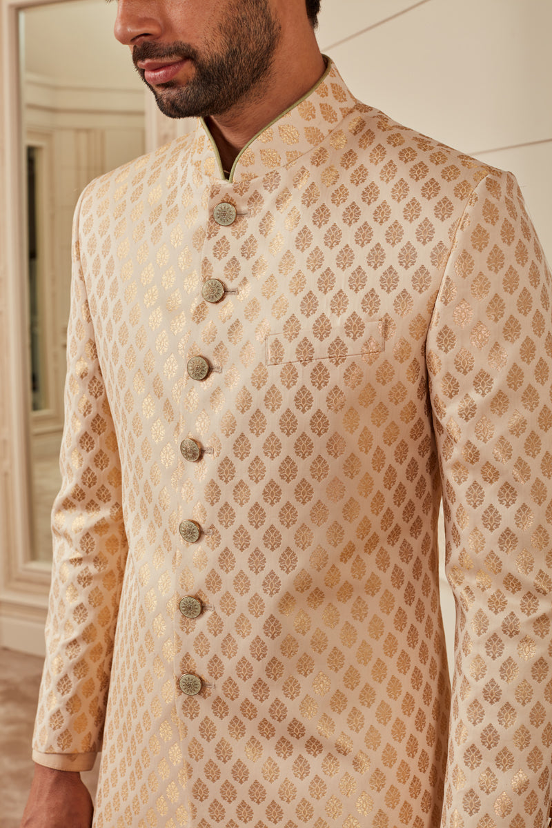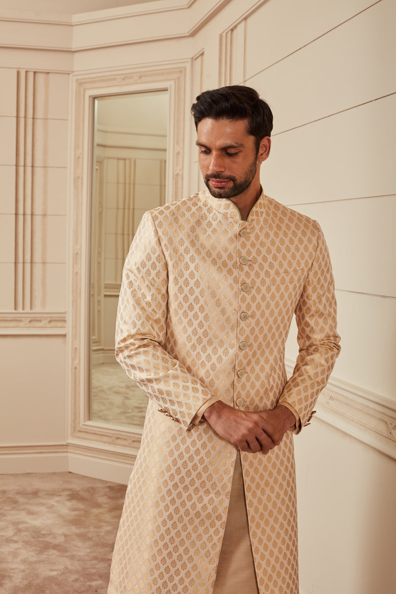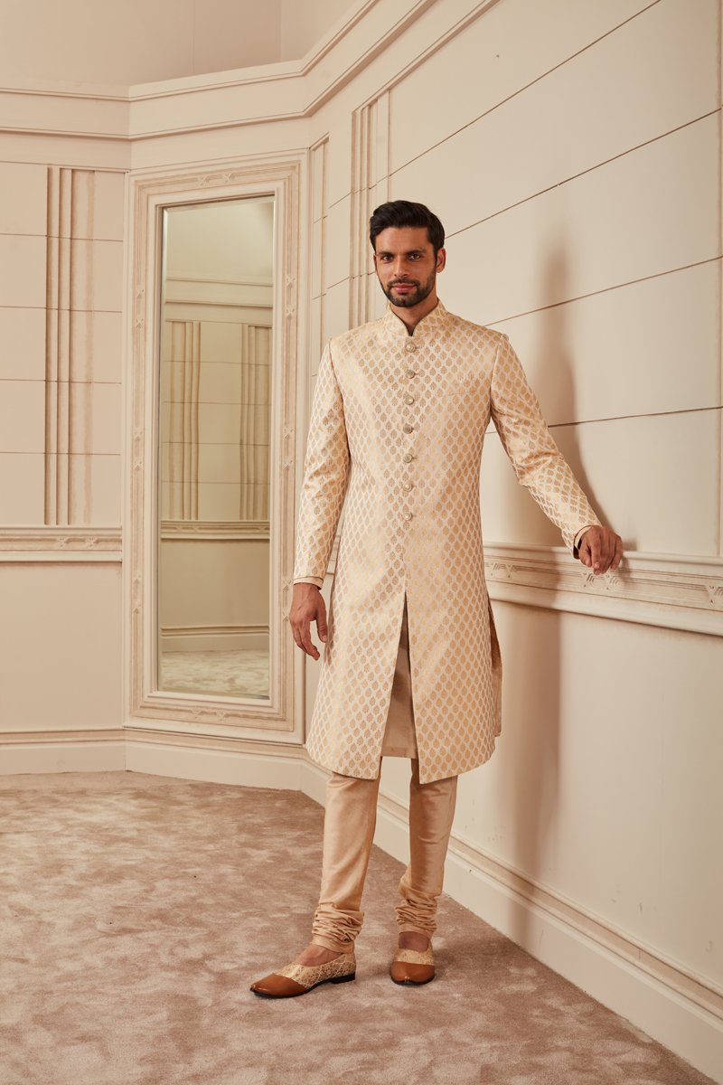 Gone are the days of heavy-duty wedding ensembles. Keep things light and easy with poly brocade sherwani in a combination of ivory and gold. Adorned with gold metallic buttons, the piece looks best paired with a gold kurta and churidar set. Add some detail to the outfit with two-toned leather and brocade mojris.