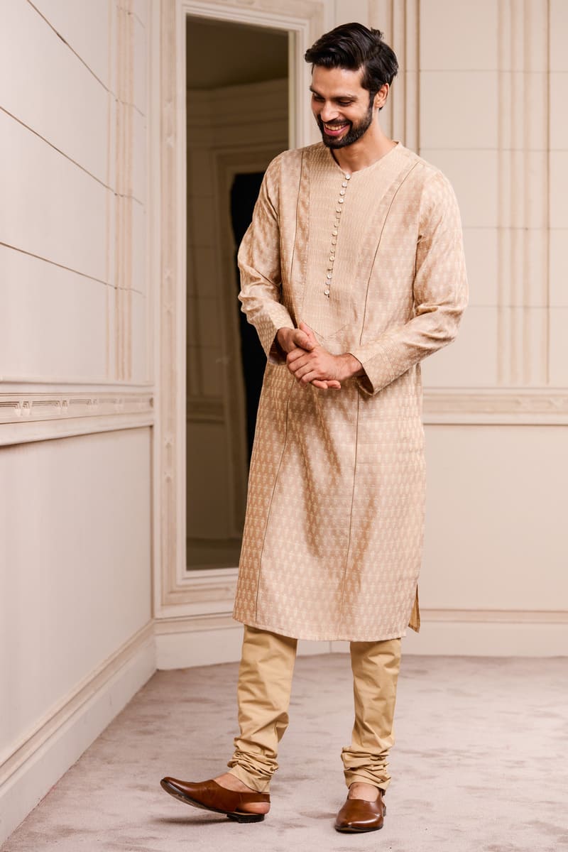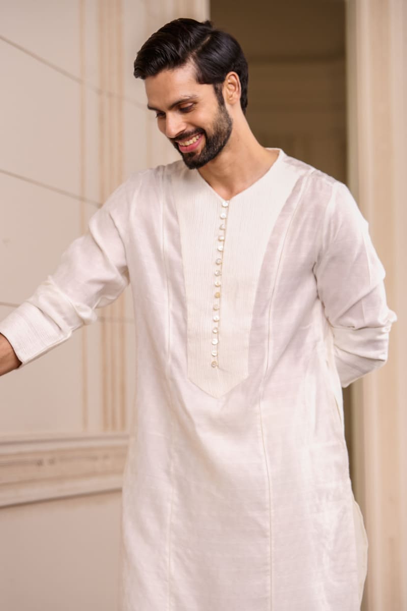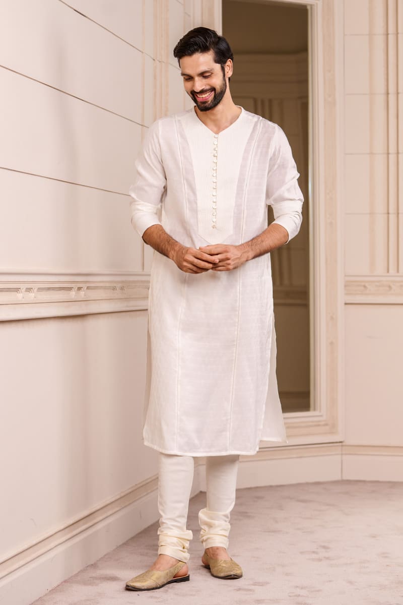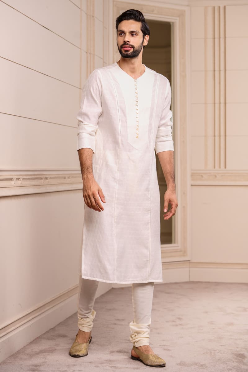 An ivory kurta set is a safe and versatile choice.The kurta is made in a jacquard fabric, with texturing details on the front yoke panel. Style this and the matching churidar with a bright bundi jacket for a day event or a classic achkan for a more formal occasion.