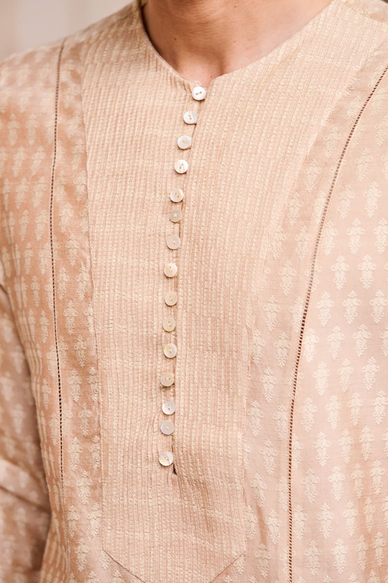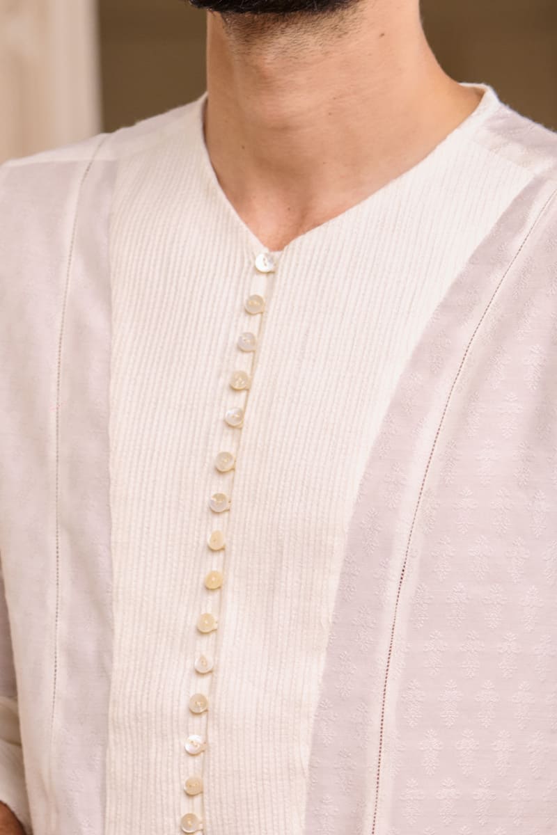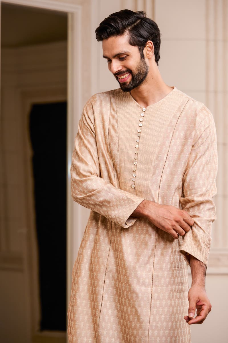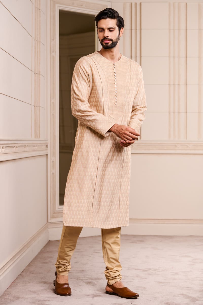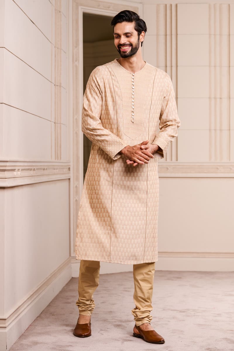 An ivory kurta set is a safe and versatile choice.The kurta is made in a jacquard fabric, with texturing details on the front yoke panel. Style this and the matching churidar with a bright bundi jacket for a day event or a classic achkan for a more formal occasion.