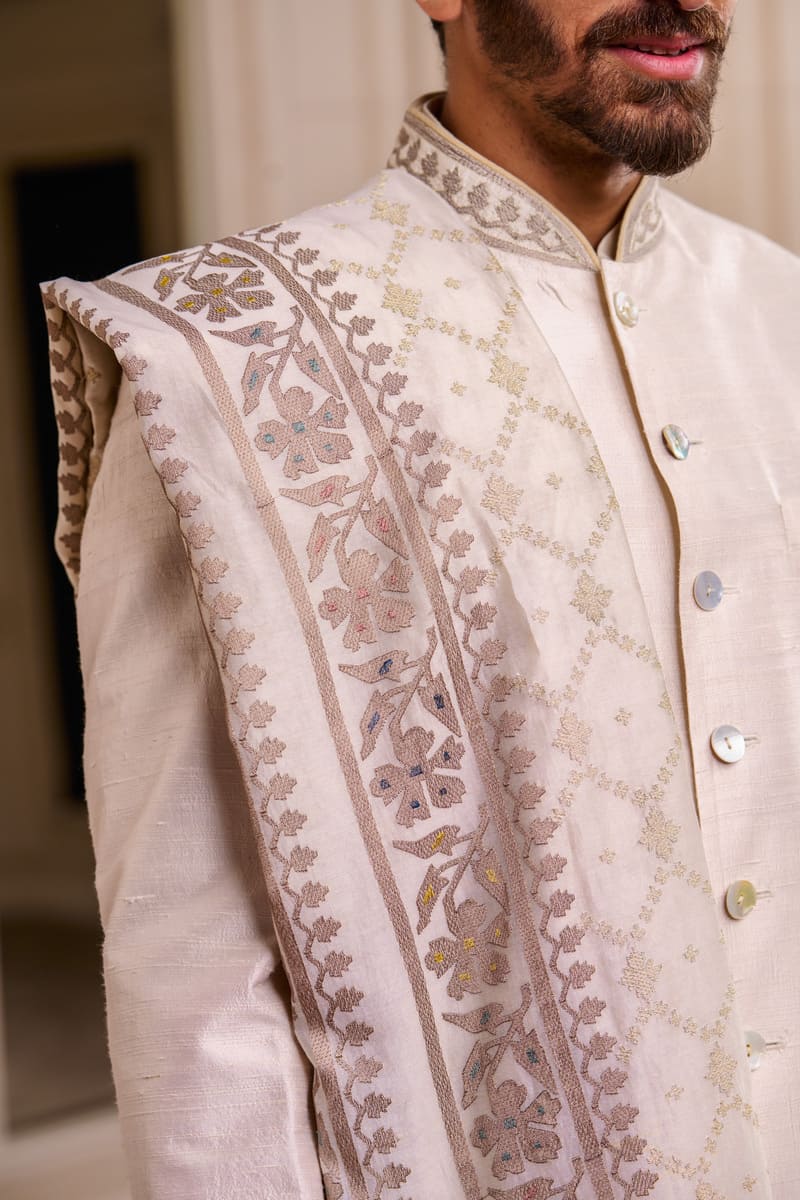 A classic sherwani,in pure silk and paired with a Jamdani stole. The sherwani has dori embroidery on the collar and cuffs. The palette of the stole is played off in the embroidery colours of the sherwani. Add an ivory churidar and complete the outfit.