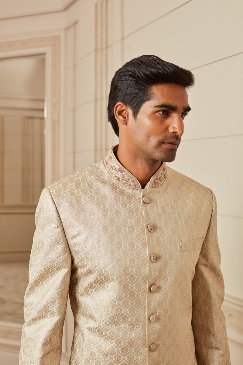 Simplicity washes over this ivory sherwani designed in a poly-zari brocade fabric, perfect for those initiate day weddings. Featuring an embroidered collar and dainty metallic buttons, the piece is to be paired with ivory-coloured kurta and churidar pants. Keep the overall look neutral by wearing ivory and gold brocade moccasins.