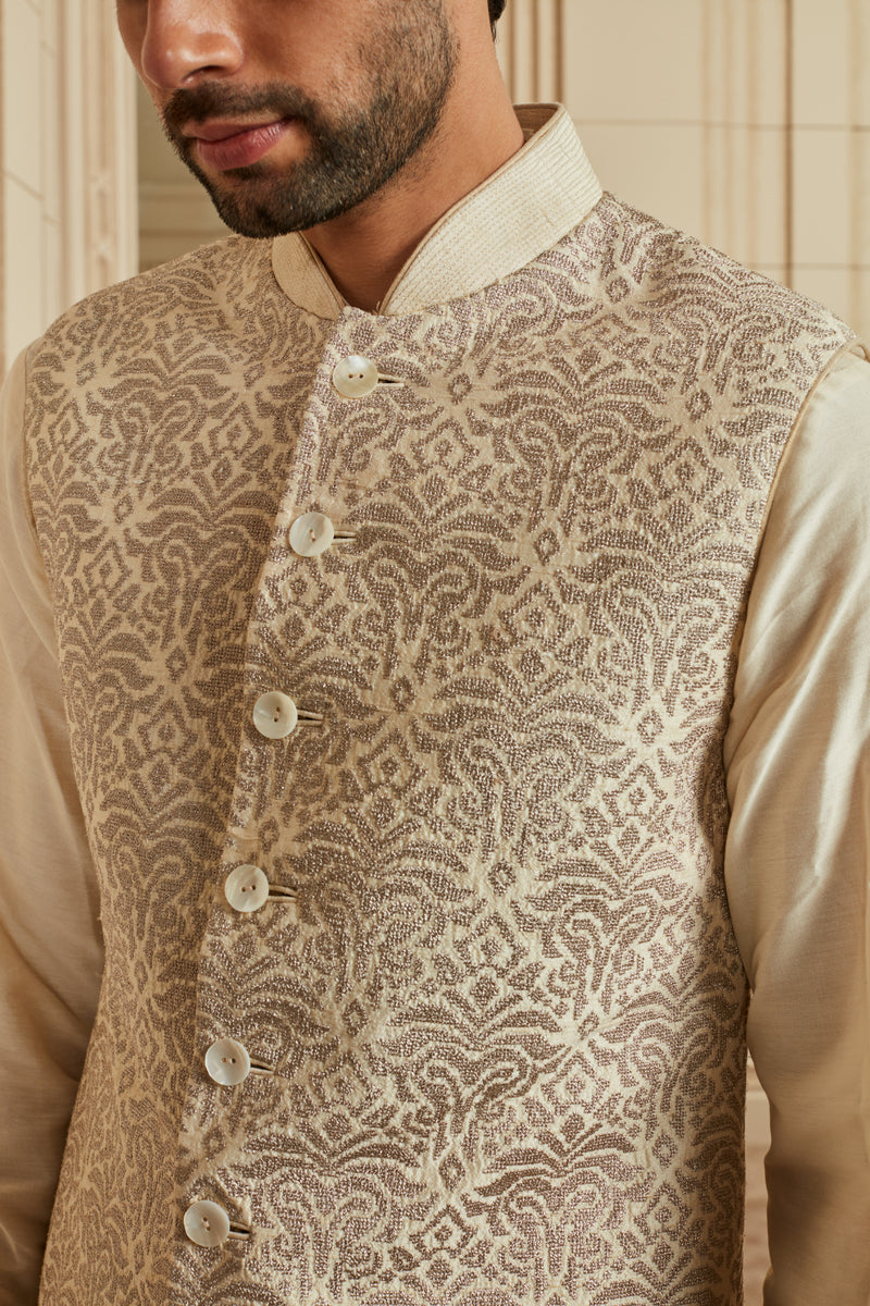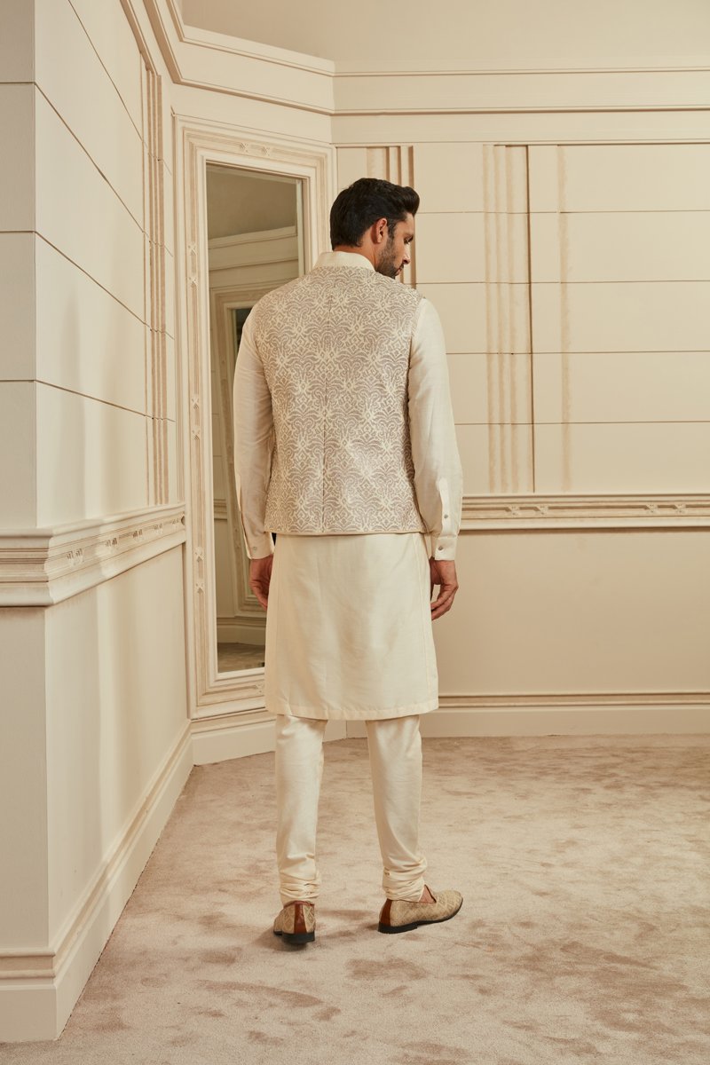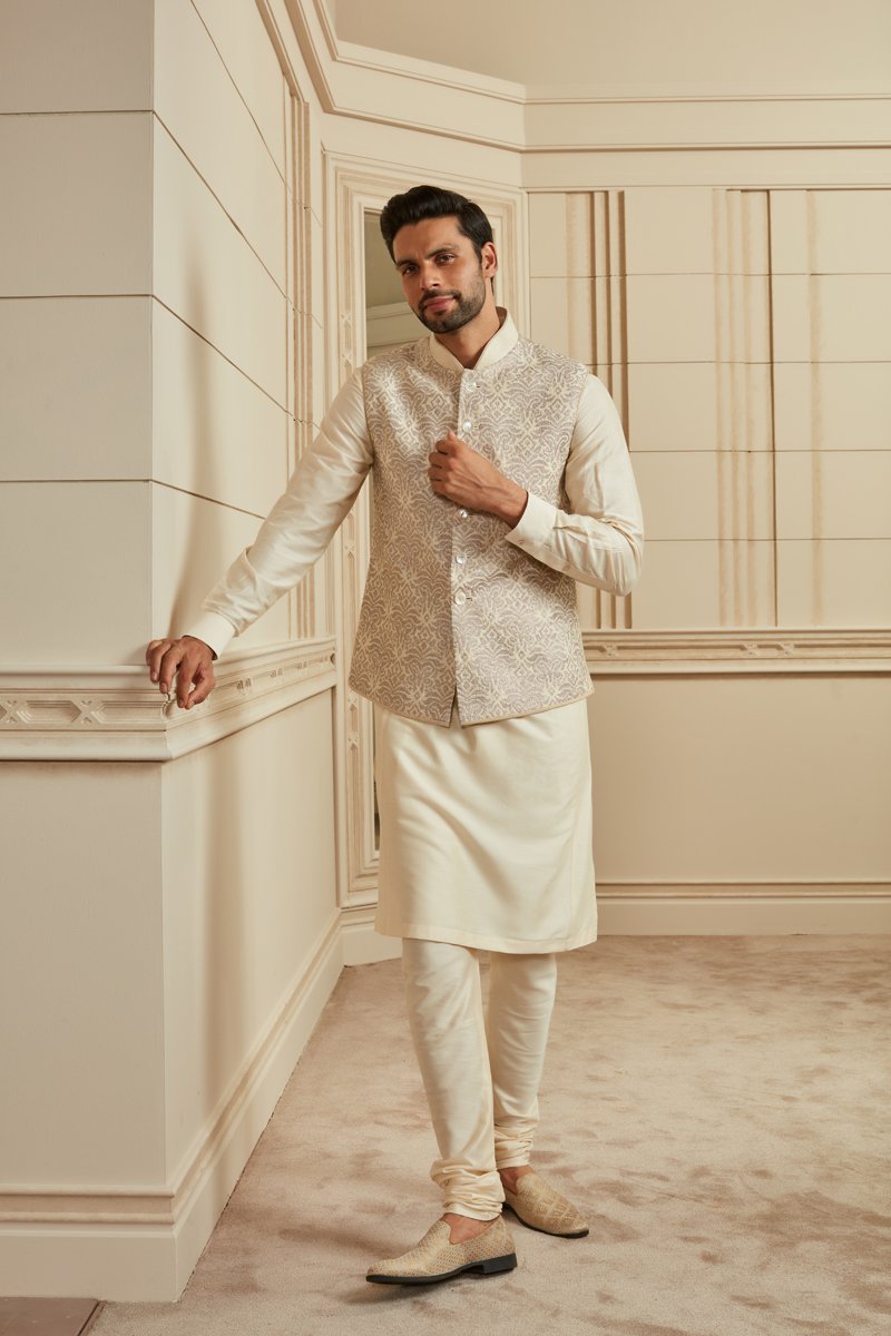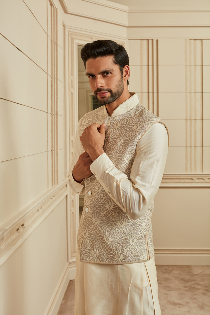 Some grooms prefer to keep their day look classic without the use of too much colour and intricate work. If you’re one of them, then our ivory bundi in a raw silk fabric is meant for you. Tastefully embellished with silver sequins and embroidered throughout, the jacket is designed with a plain collar. It comes in a set with a matching ivory kurta that can be paired with churidar pants. Add a bit of old-world style by pairing it with brocade moccasins.