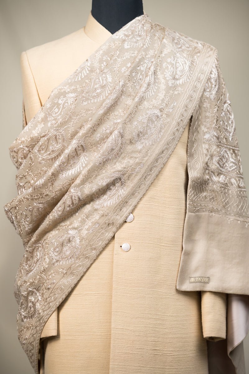 A repeating jaal pattern can often be calming when it comes in a subtle colour like this beige stole that features a paisley pattern all over.