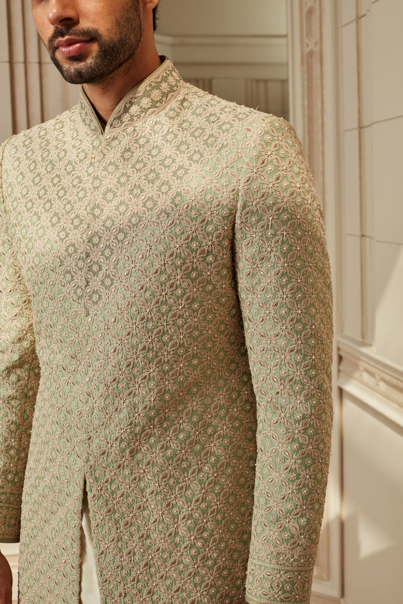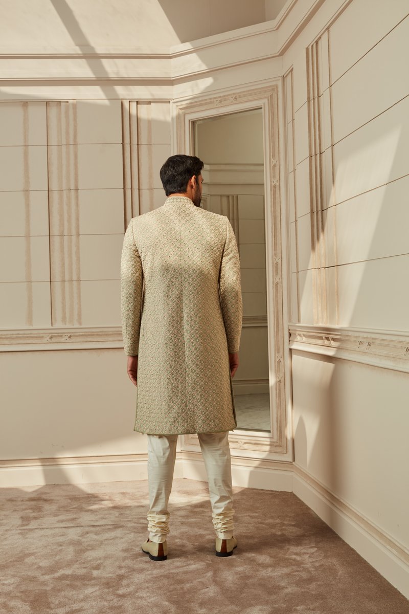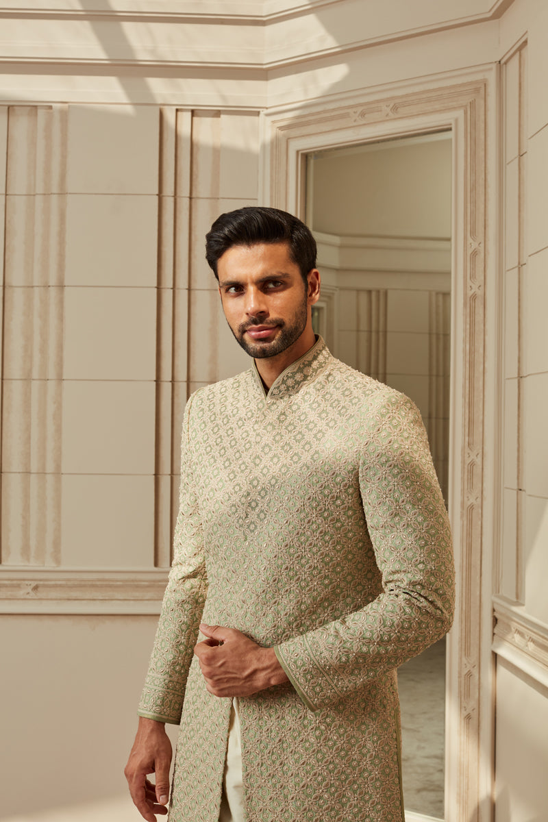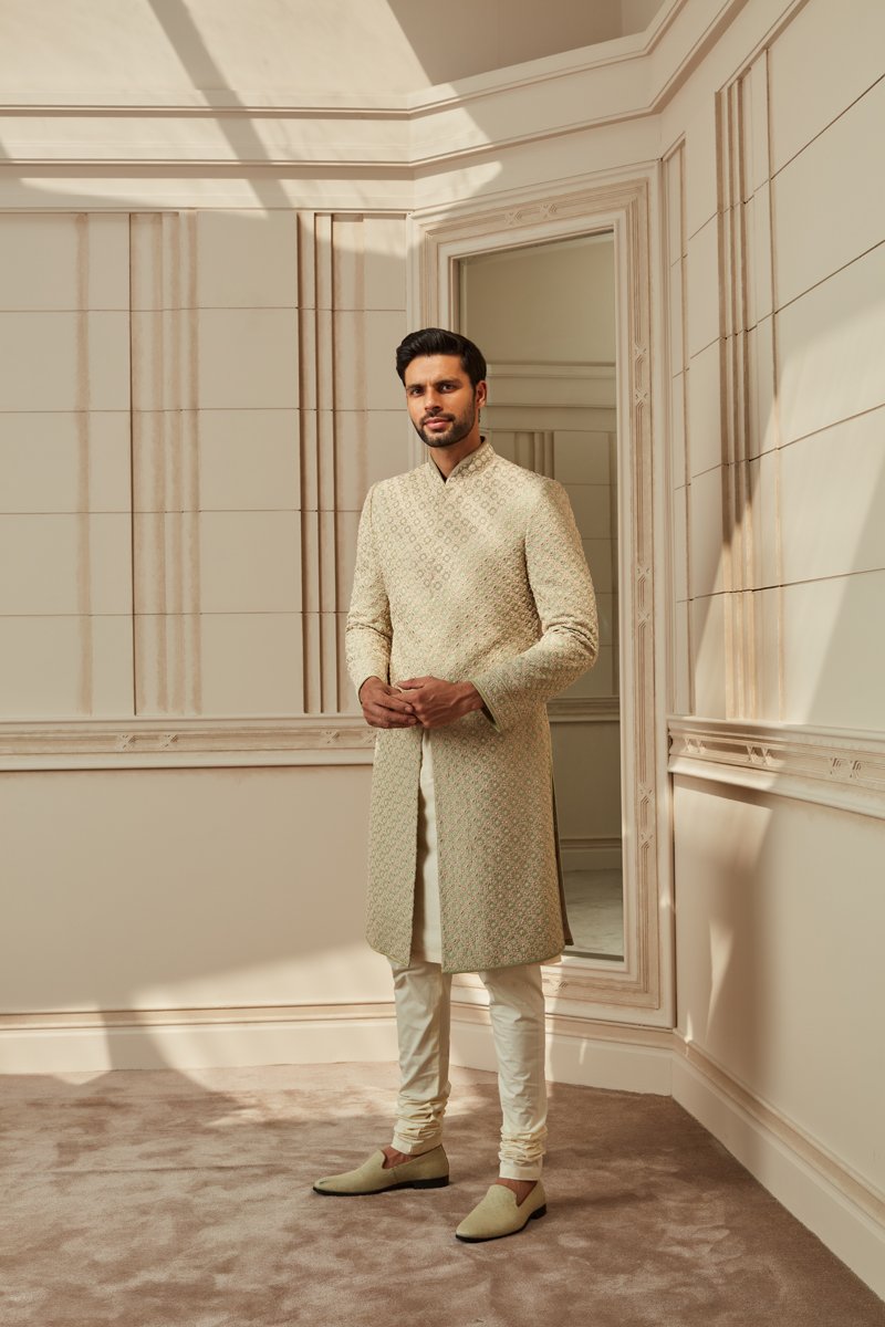 Good looks and innocence come together wonderfully when you don this pale jade sherwani on your special day. Fearing all-over thread embroidery, the piece is to be worn with an ivory kurta and churidar pants. Keep the look untouched for maximum impact, wearing only a pair of complementary sage-hued moccasins.