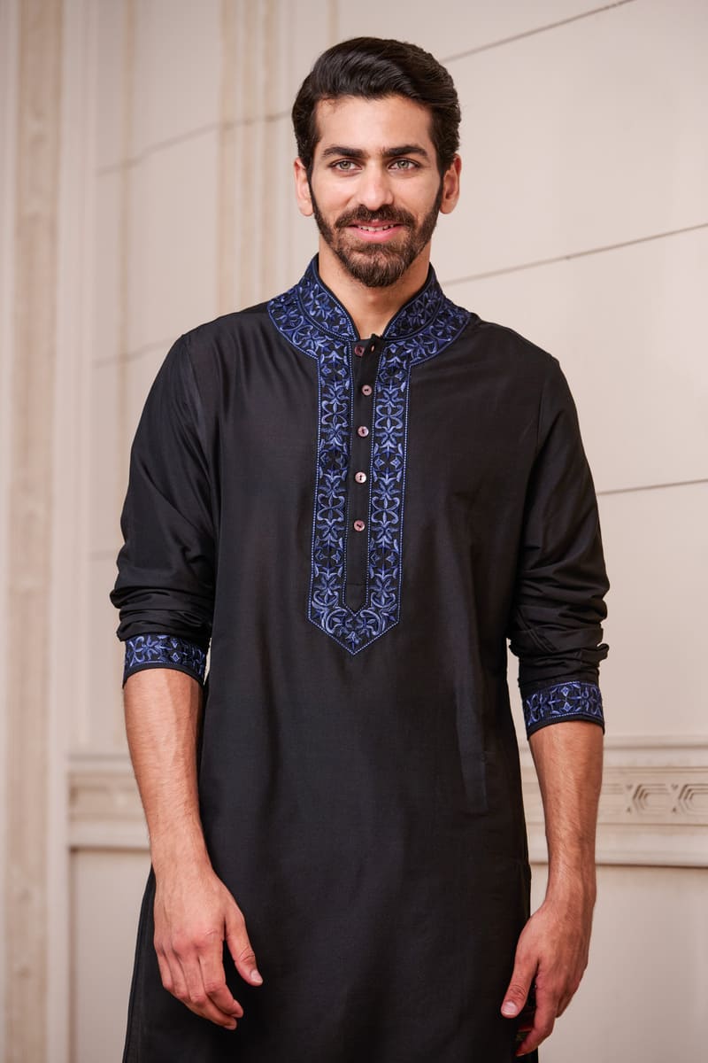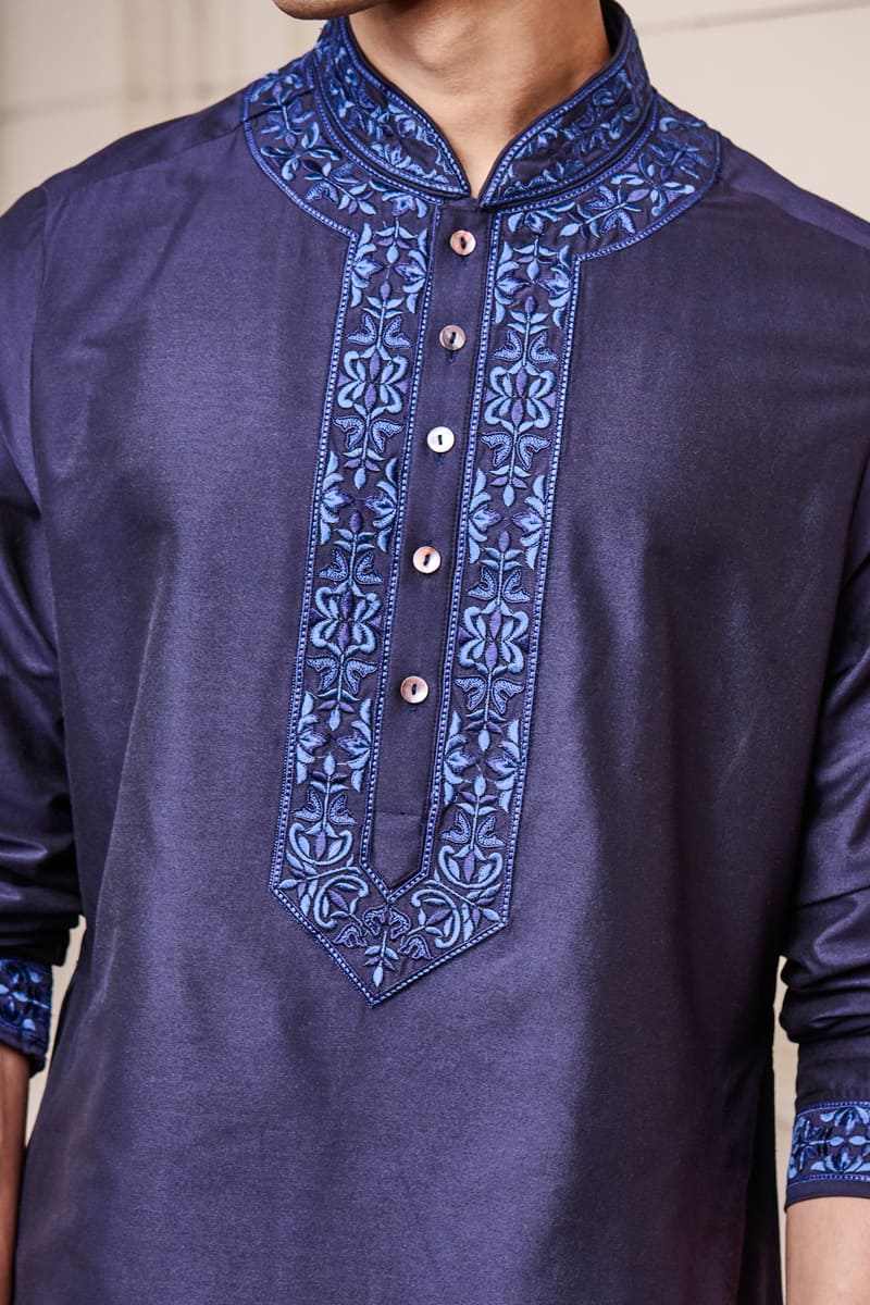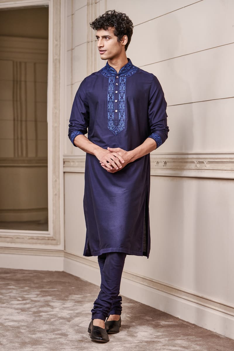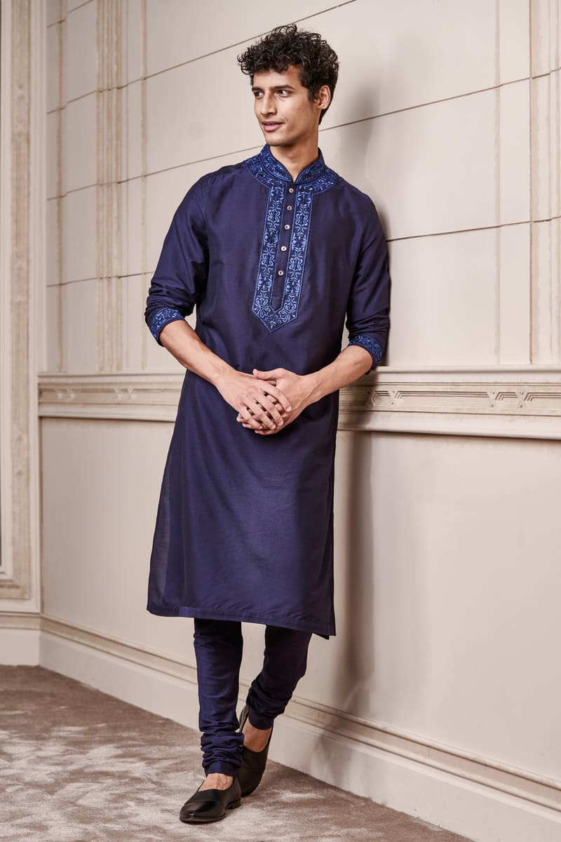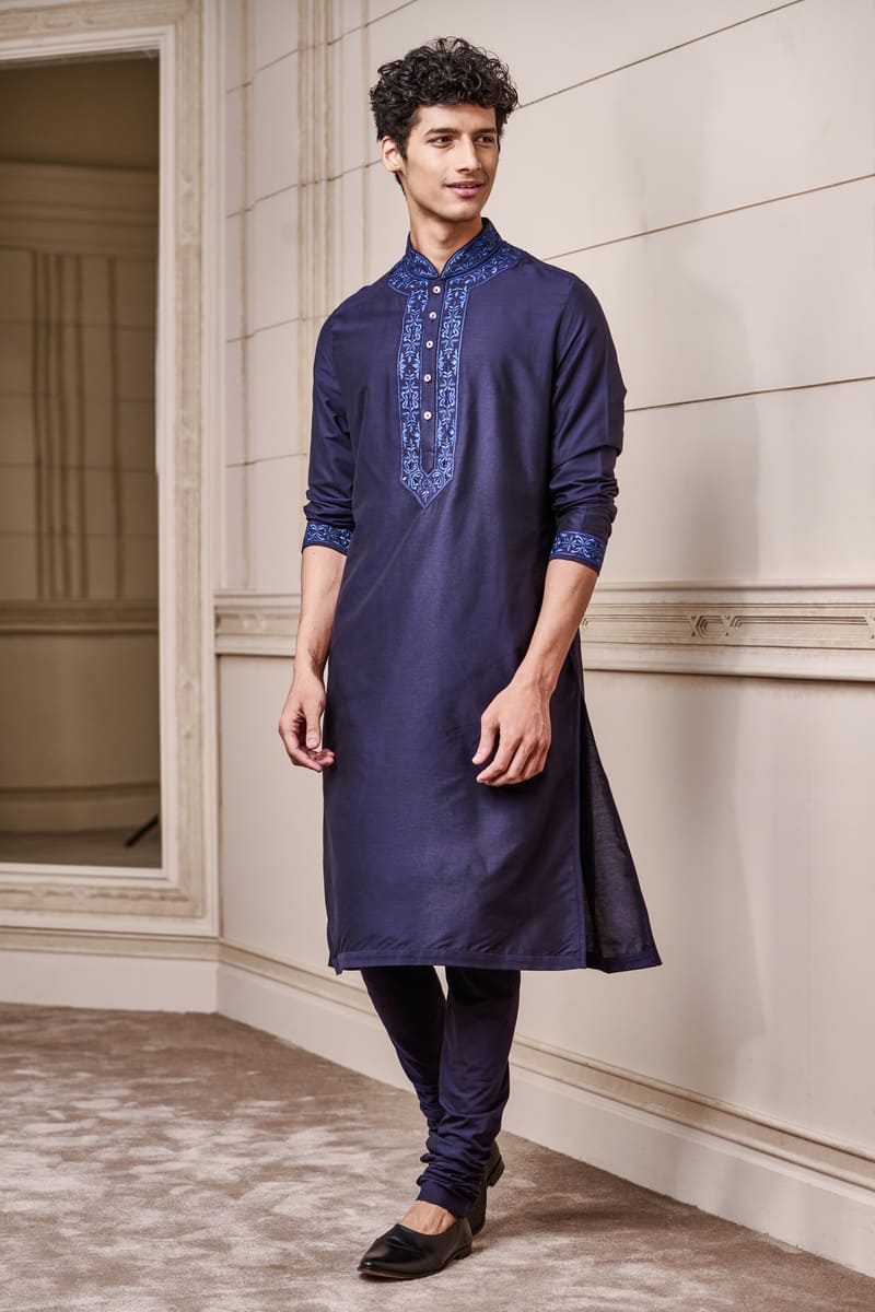 A youthful kurta set,in navy with contrast details.This kurta has thread embroidery on the collar and placket , the matching churidar complementing the colour play. Style it with a pair of black loafers for the complete look.
