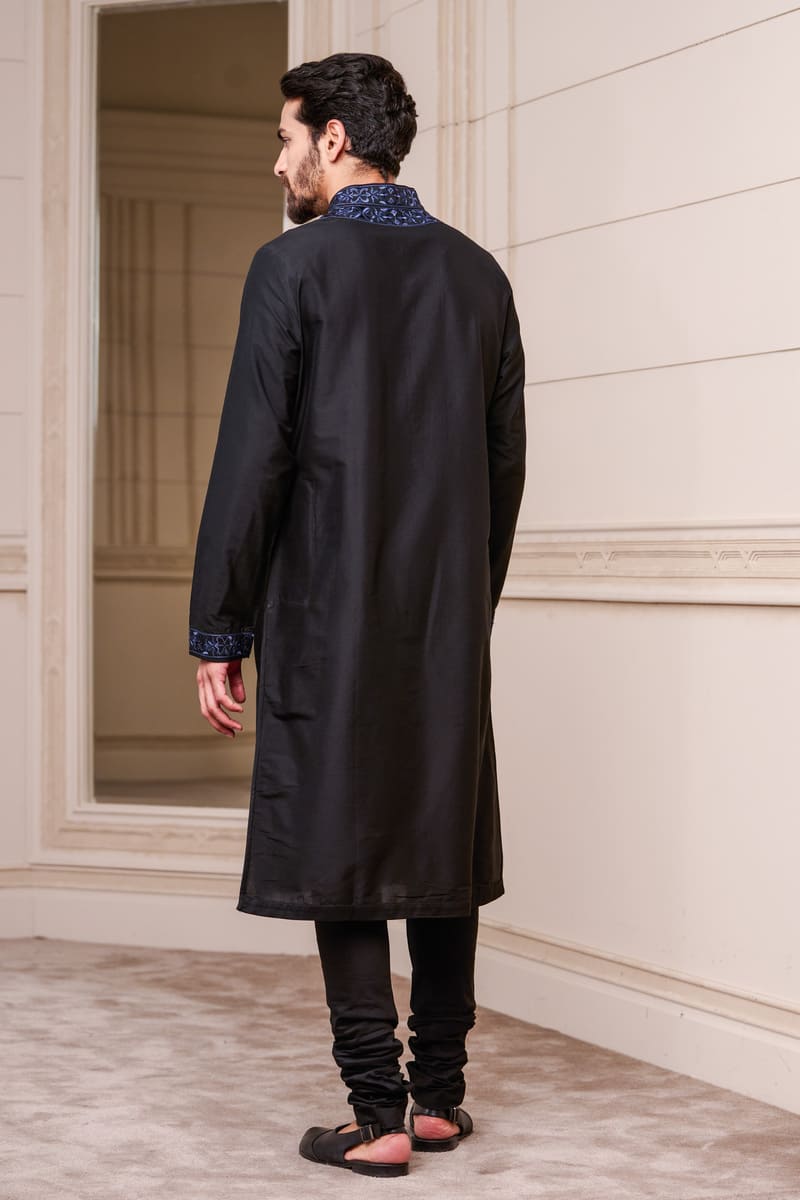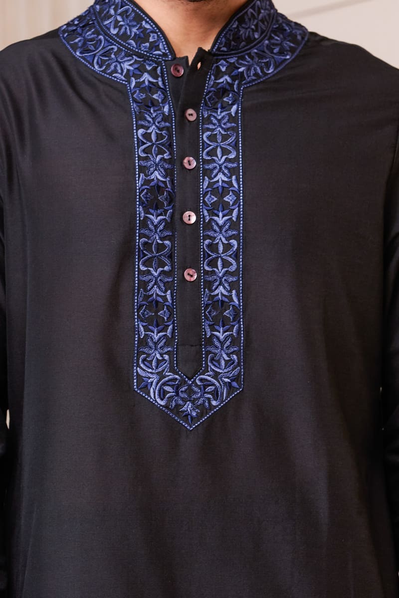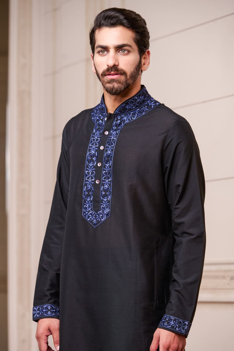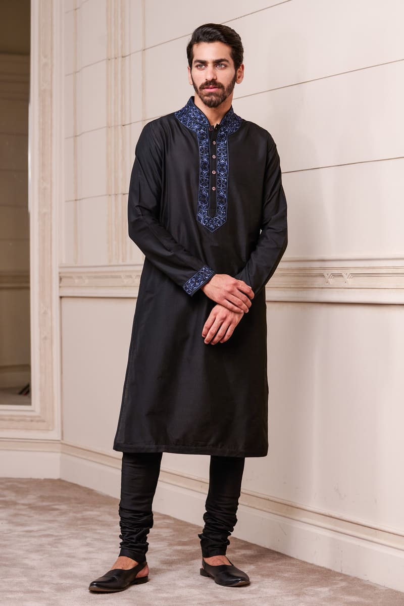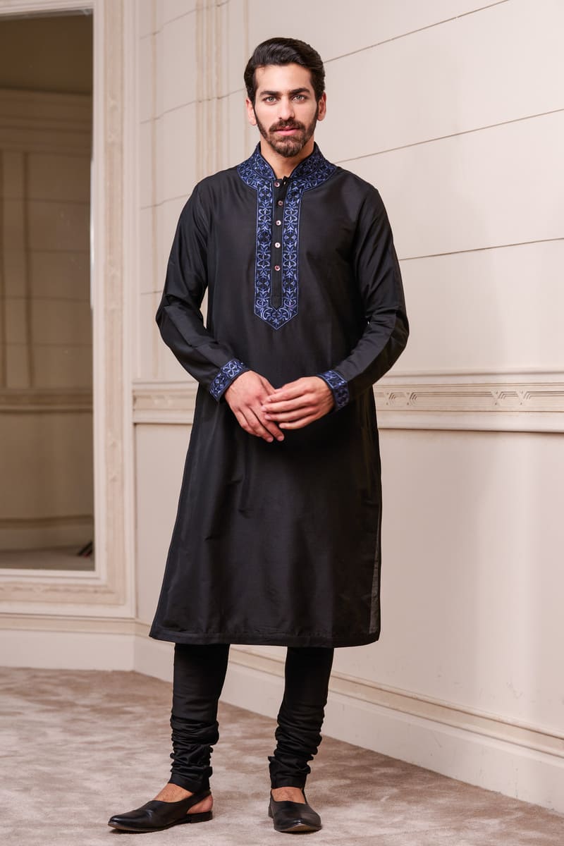 A youthful kurta set,in navy with contrast details.This kurta has thread embroidery on the collar and placket , the matching churidar complementing the colour play. Style it with a pair of black loafers for the complete look.