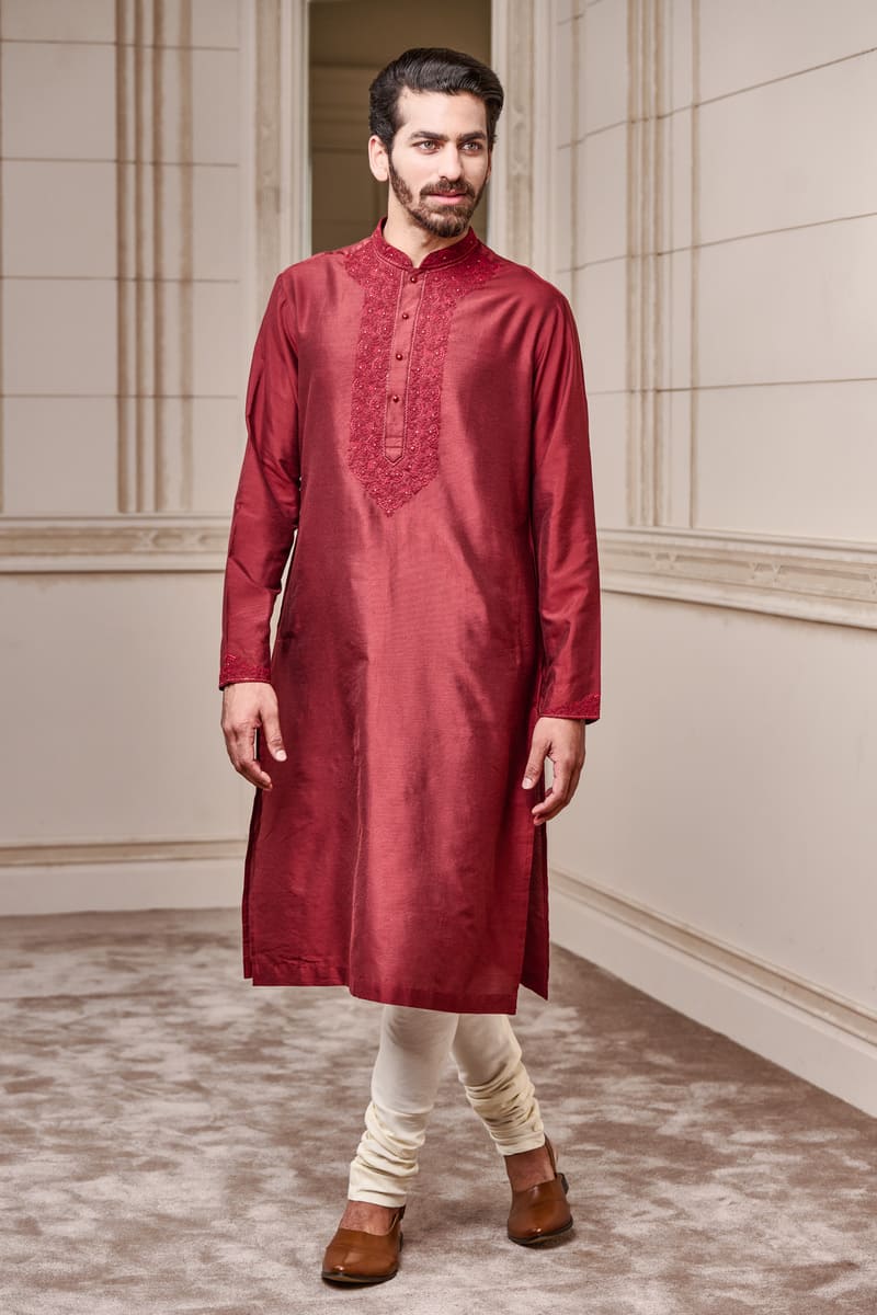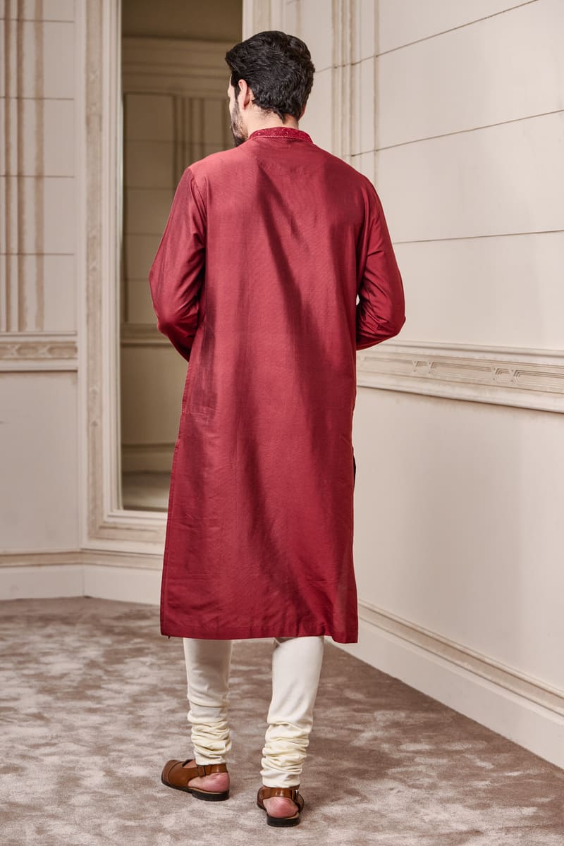 A kurta set with an ivory churidar. The kurta is in a festive maroon colour and has dori and thread embroidery on the neck and sleeves. You cannot go wrong with this choice, add on a bundi jacket for the evening look.