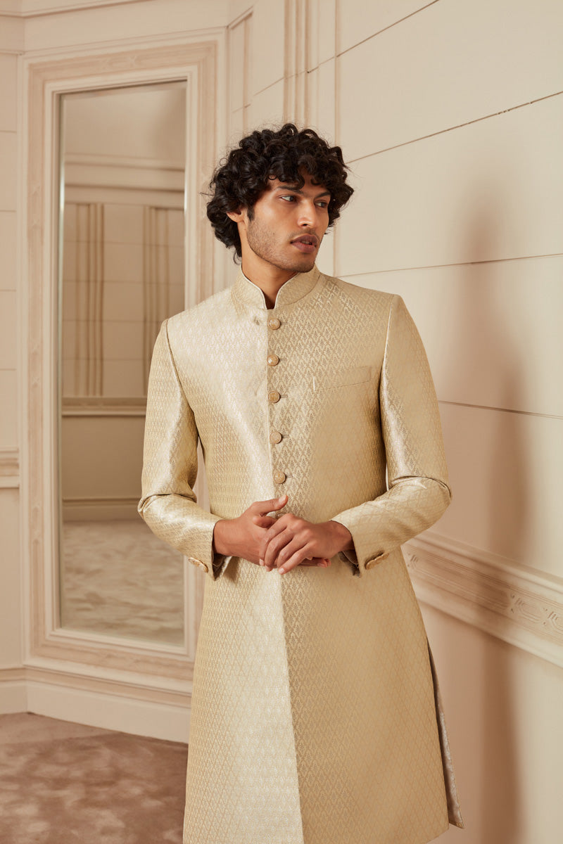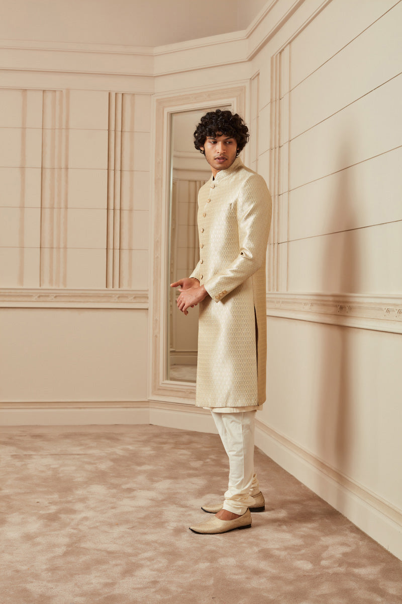 A quiet look that speaks volumes, choose this light gold poly-zari brocade fabric for your special day. Adorned with dainty metal and enamel buttons, the piece looks best when worn with an ivory-coloured kurta and churidar pants. Ivory and gold brocade moccasins lend the look an understated appeal.
