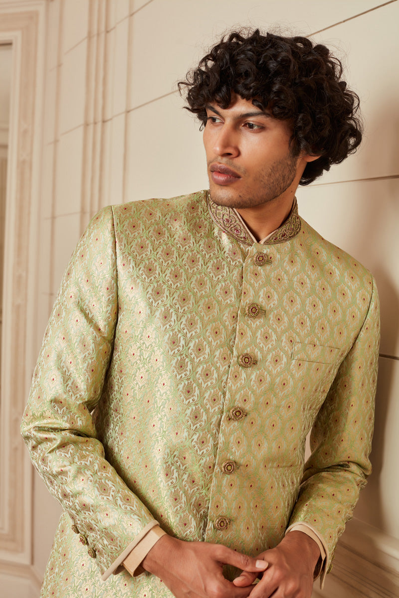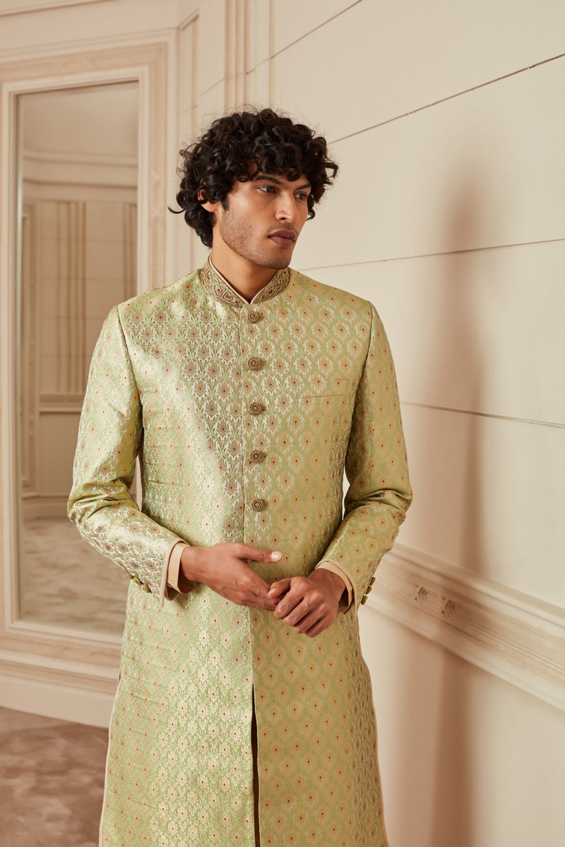 Light Green All Over Embroidered Sherwani With Zardozi Collar & Buttons