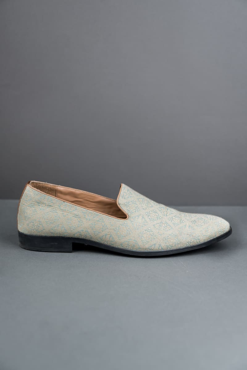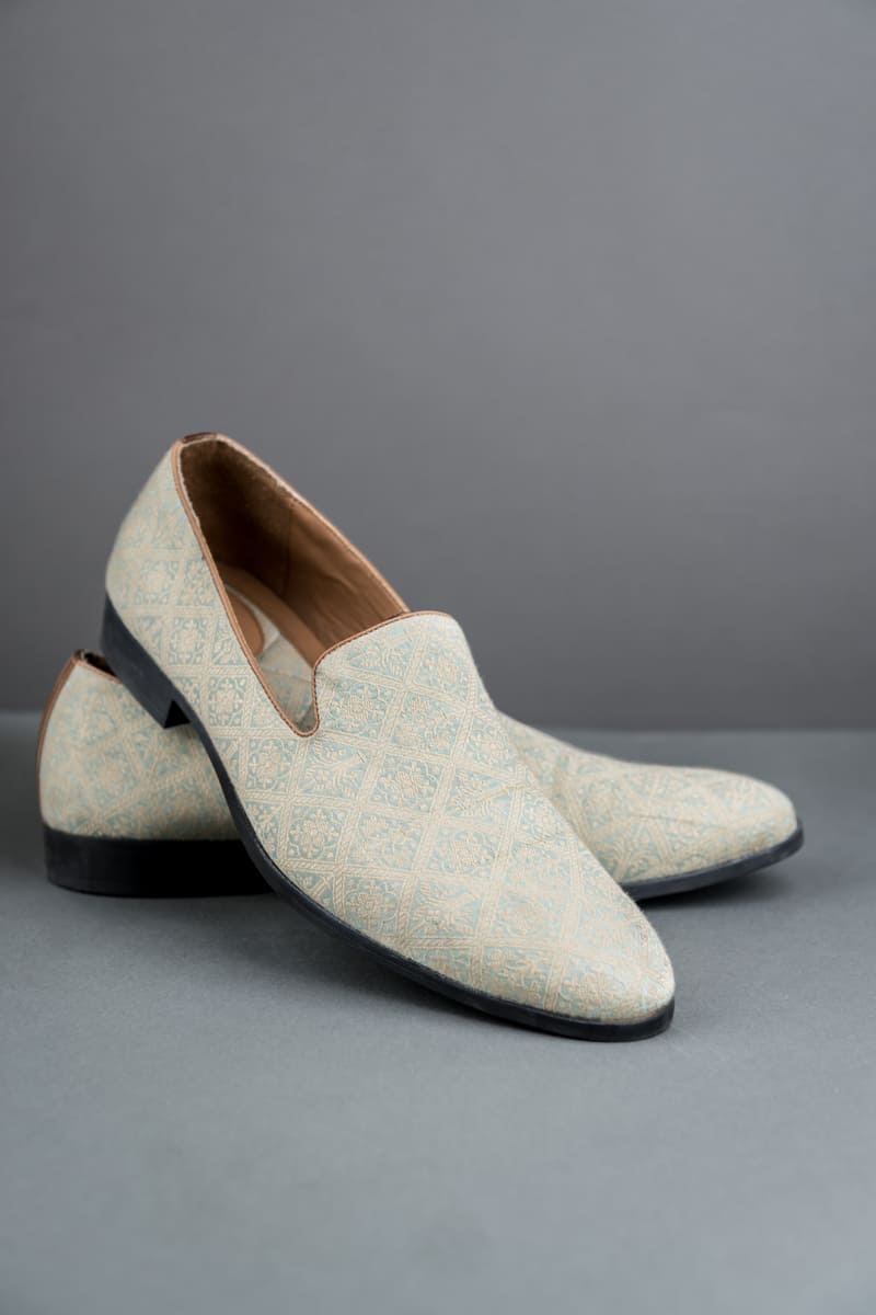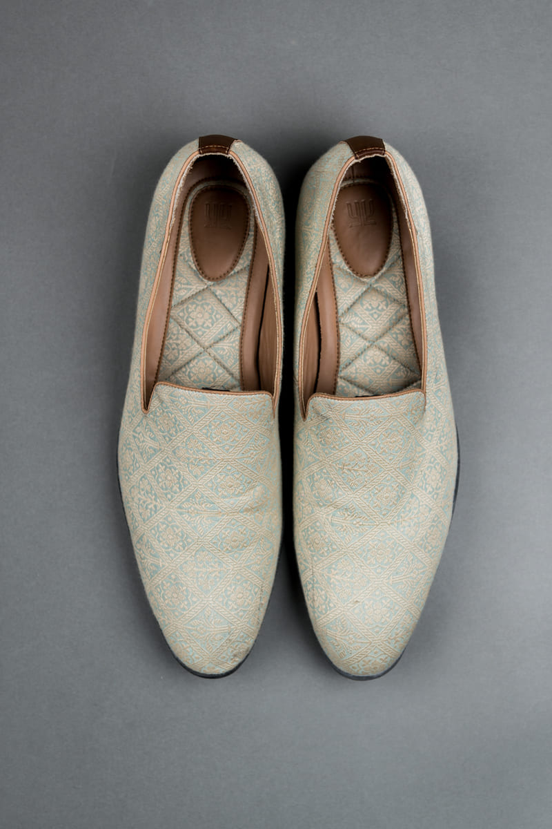 Pick a colour of footwear that will stand out, yet work well with all your weddingwear. Just like these lime green brocade mojaris.