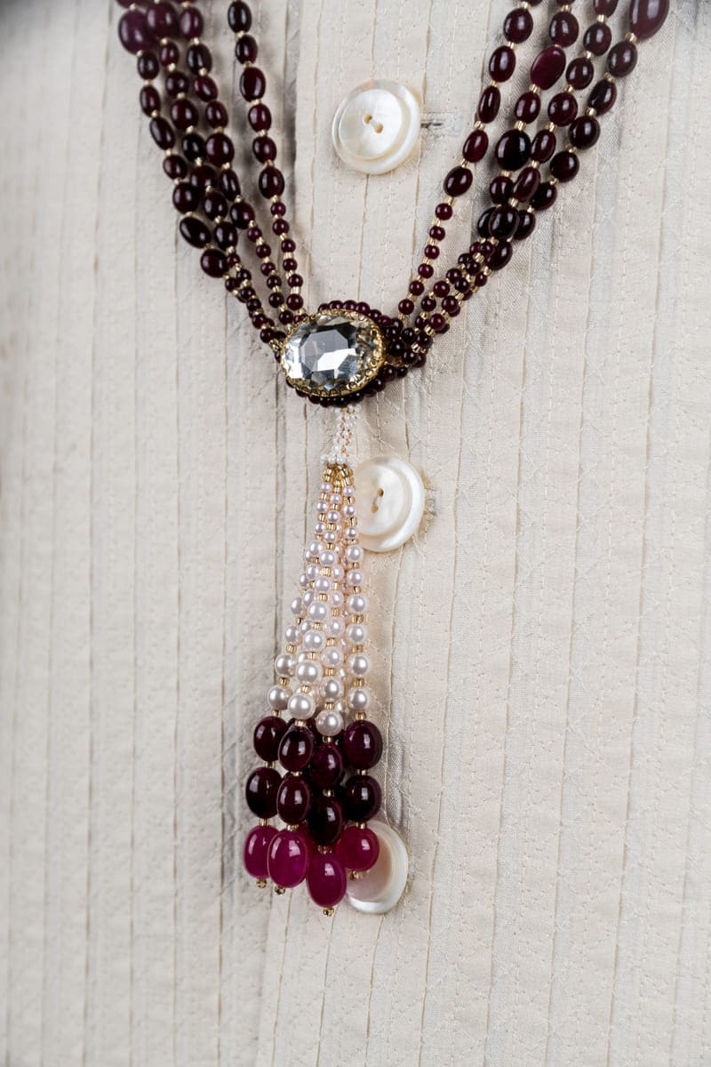 Give your wedding attire a step up with this two-toned maroon and white bead mala in four layers and fringe detailing.