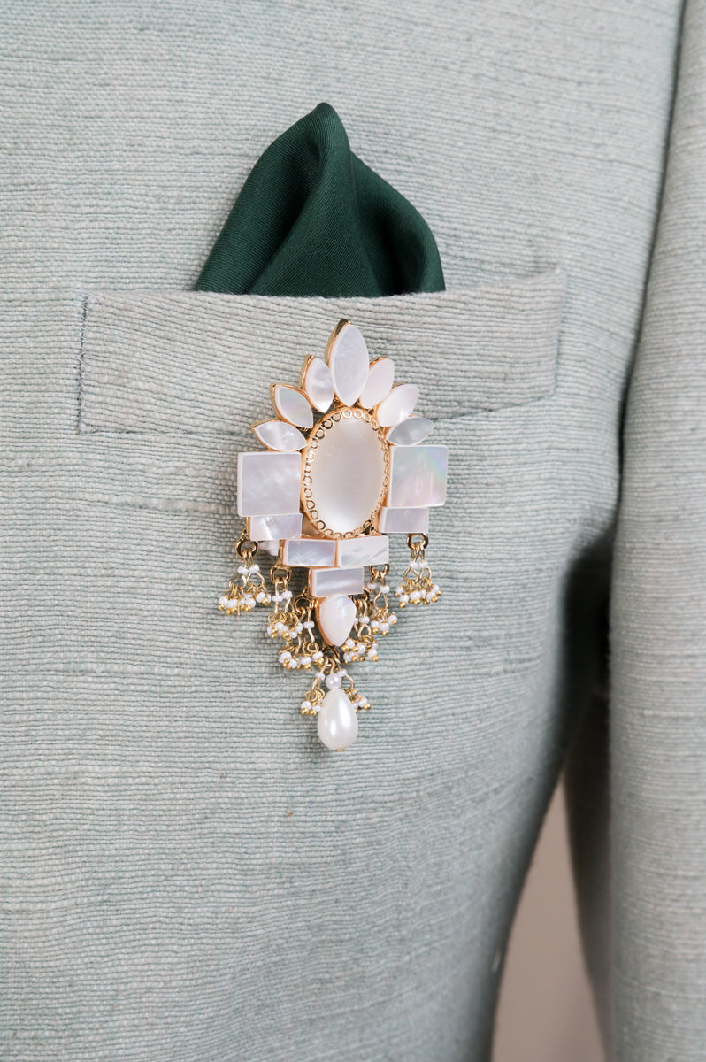A clean, sophisticated accessory for grooms is this mother-of-pearl brooch encrusted with semi-precious beads, also featuring a drop detail.