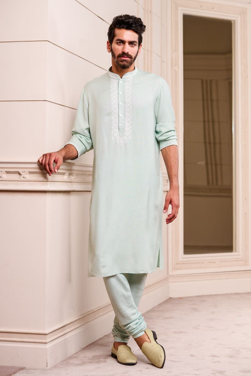 MINT GREEN COTTON KURTA WITH PLACKET AND SLEEVES EMBROIDERY