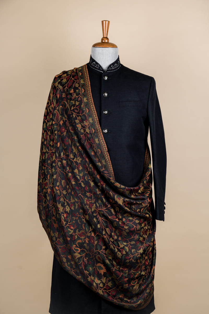 A dark palette of browns and greens punctuated with a bright yellow comes to life in this floral-patterned stole.